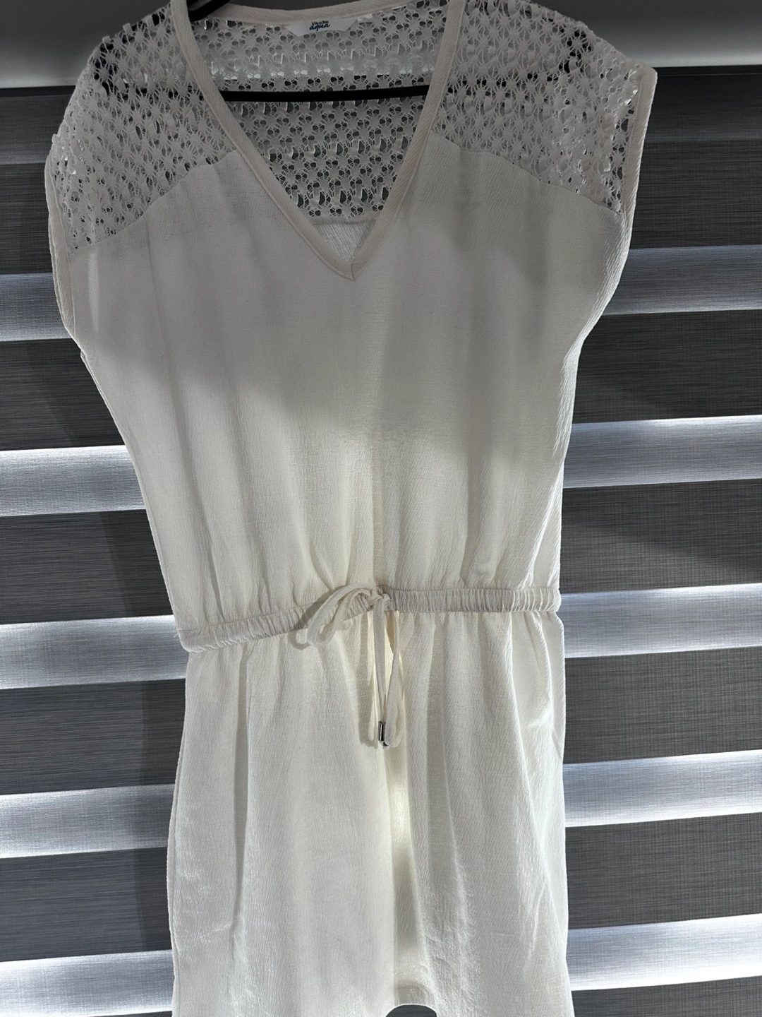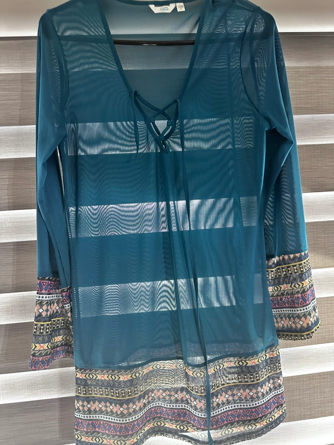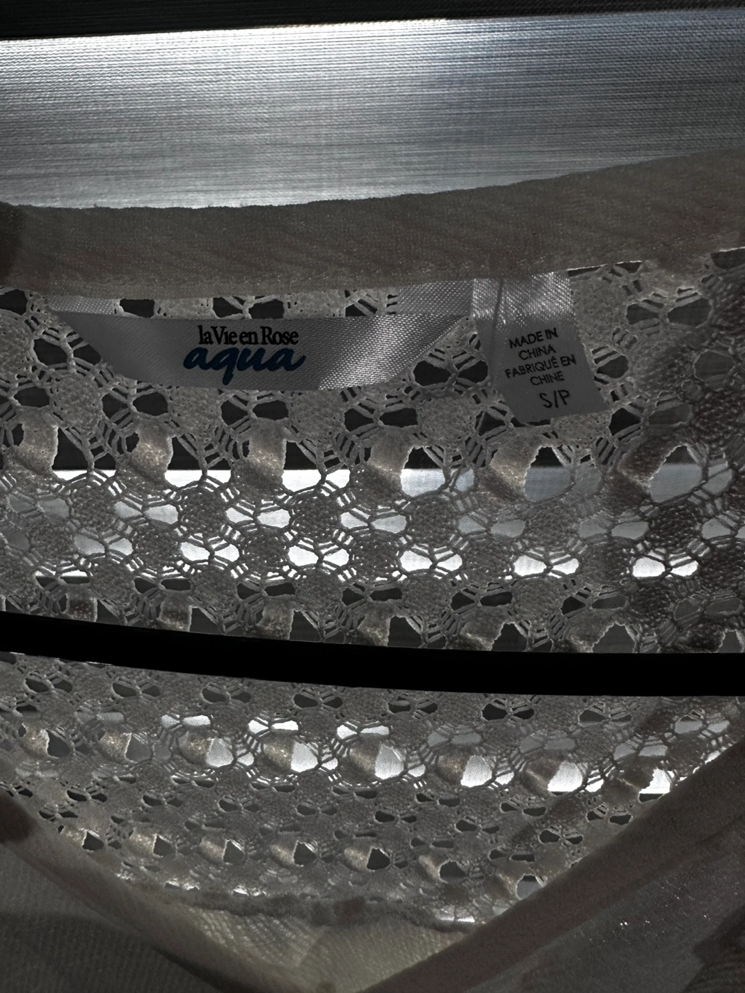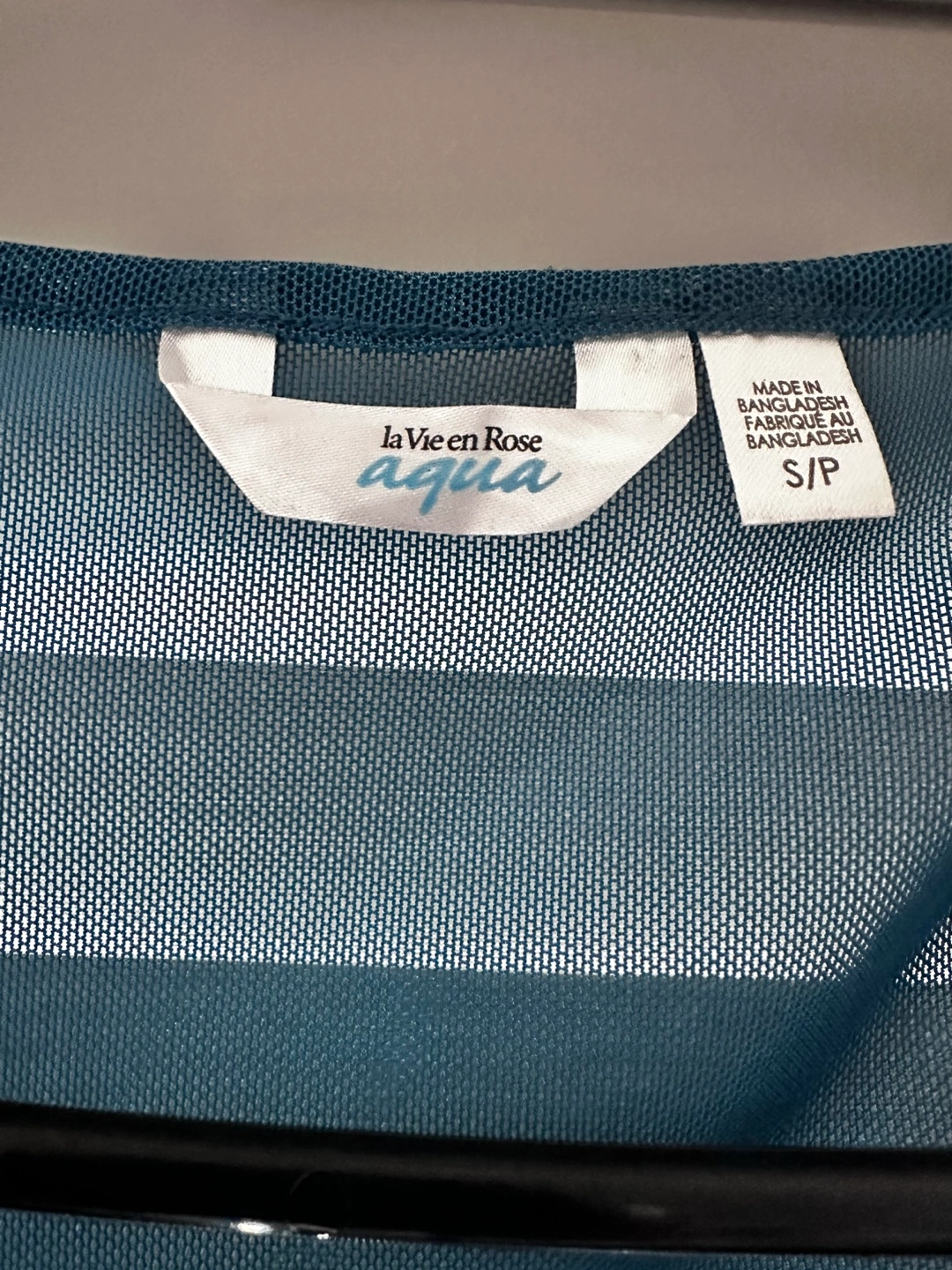 20Bundle includes two La Vie en Rose Aqua tops. Teal mesh long-sleeve top with patterned cuffs. White eyelet-trimmed short-sleeve top with drawstring waist. Both size small.