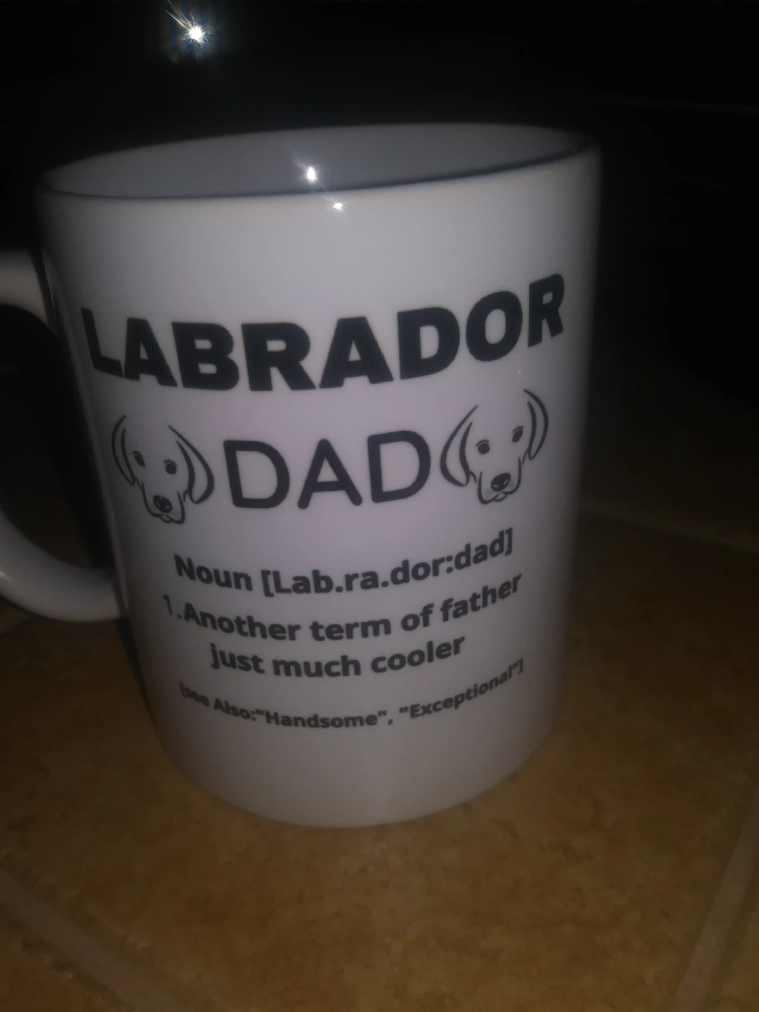 36Selling a Labrador Dad mug! It's white with black lettering and a cute design. Perfect for any proud Labrador owner or dog lover!