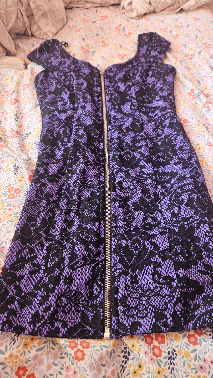 Cute mini dress with a lace pattern in purple and black. It features a zipper down the front. Great for a night out!
