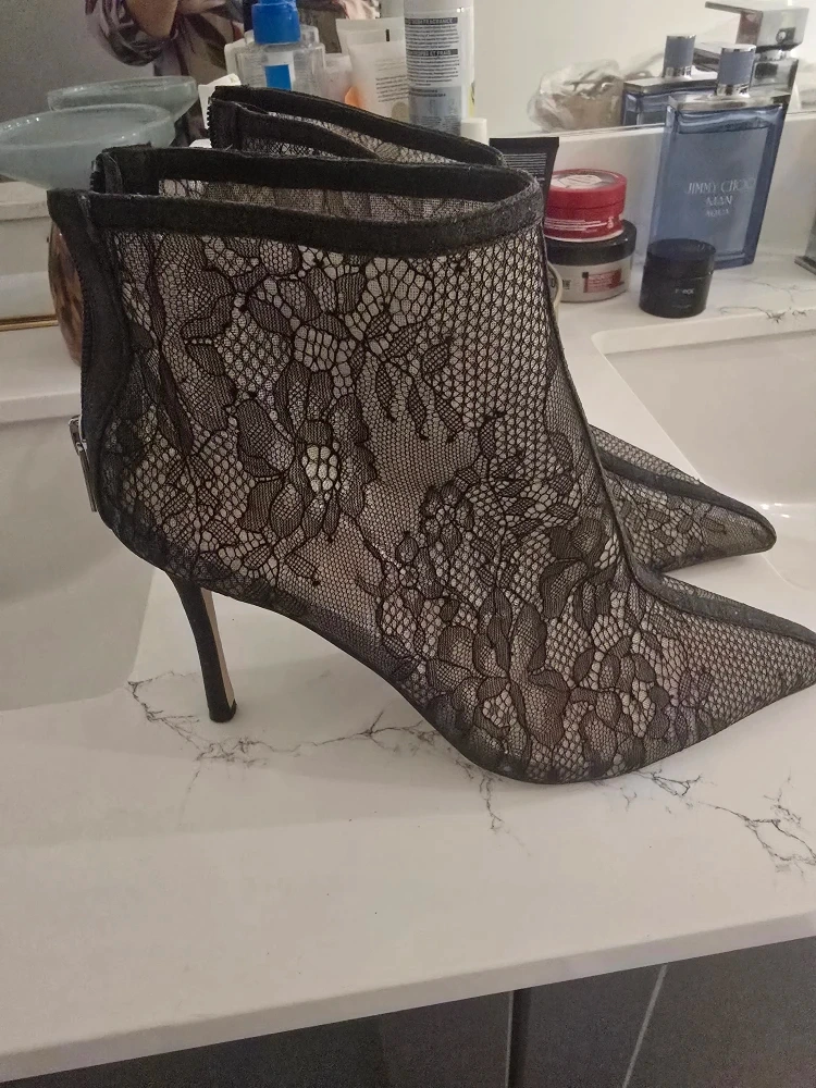 60Selling a pair of stylish lace pointed-toe heeled booties! They're in great condition and would be perfect for adding a touch of elegance to any outfit