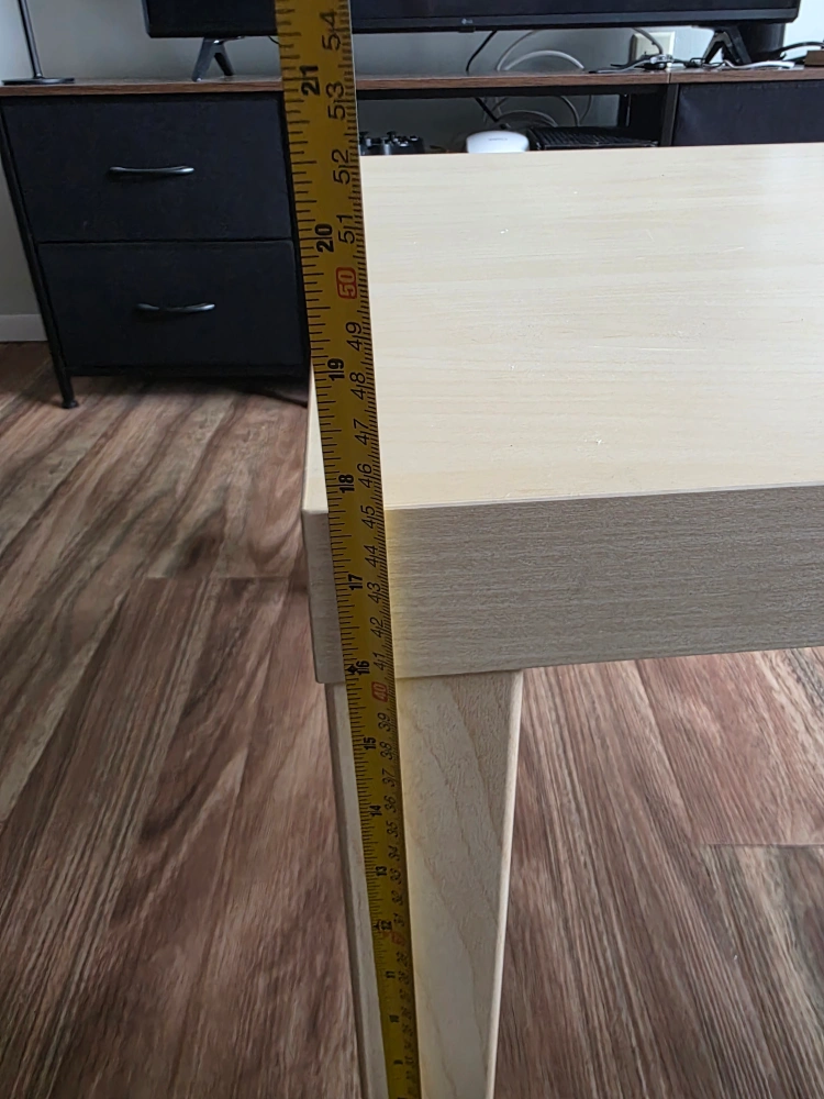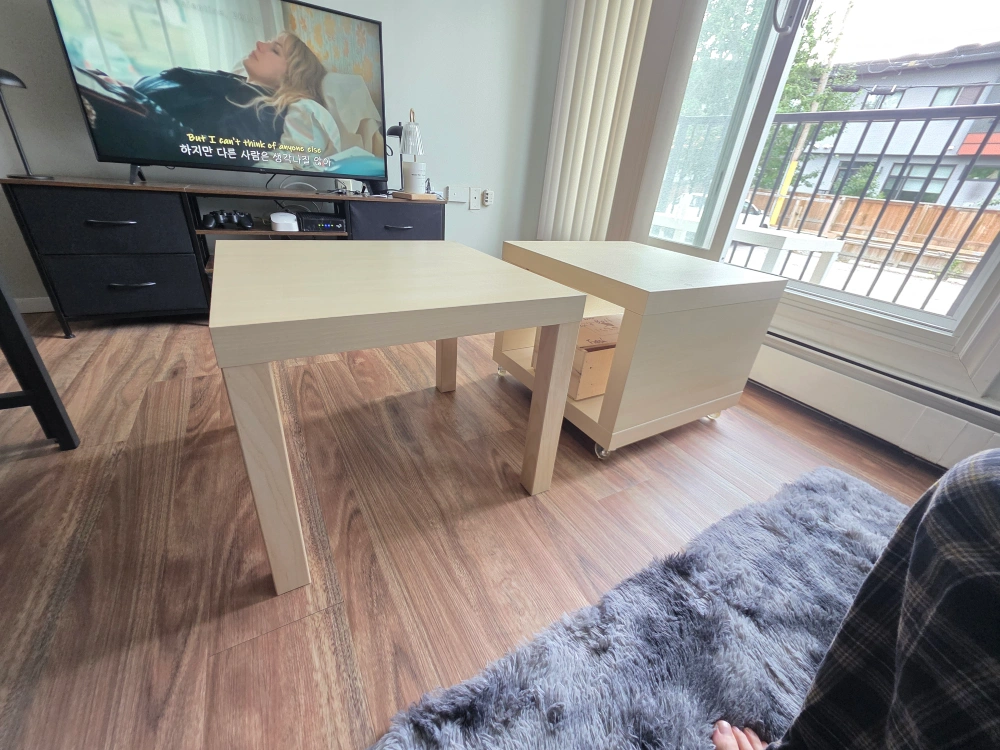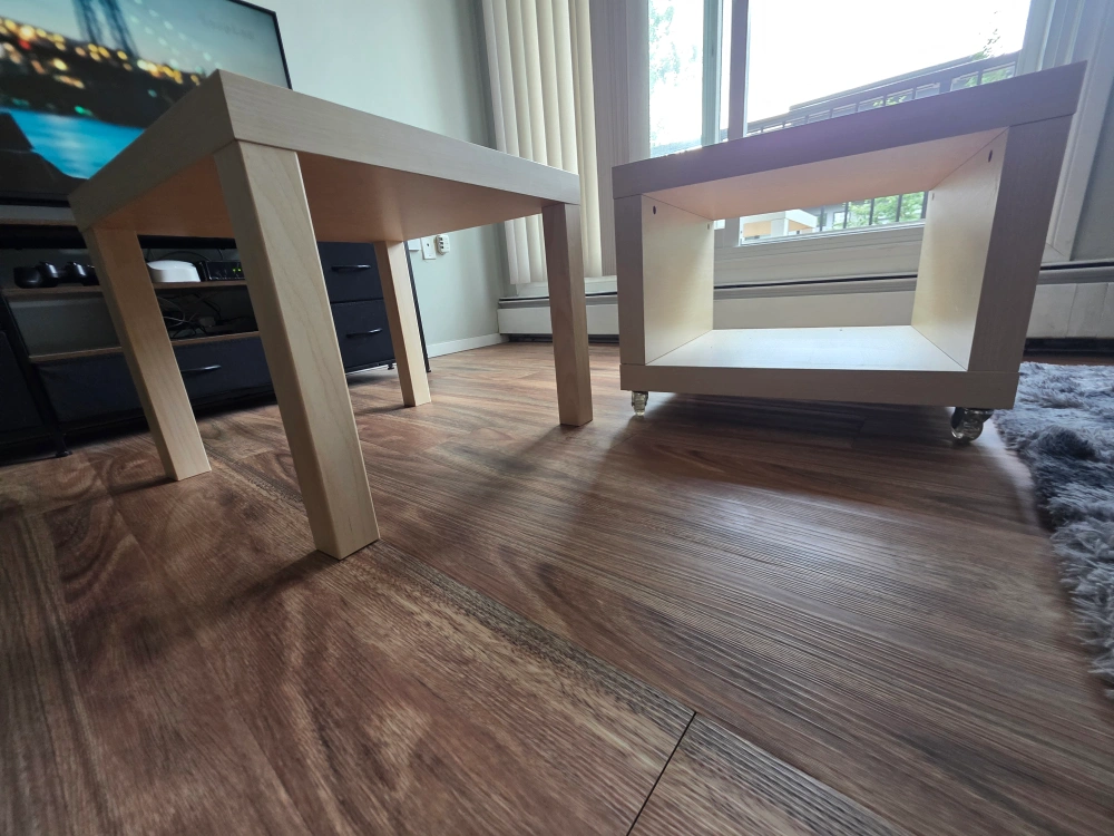 Selling a set of two Lack side tables in beige. One is a standard side table, and the other is a side table with wheels for easy moving. The standard table is about 21 inches tall, and the other is about 17 inches tall.