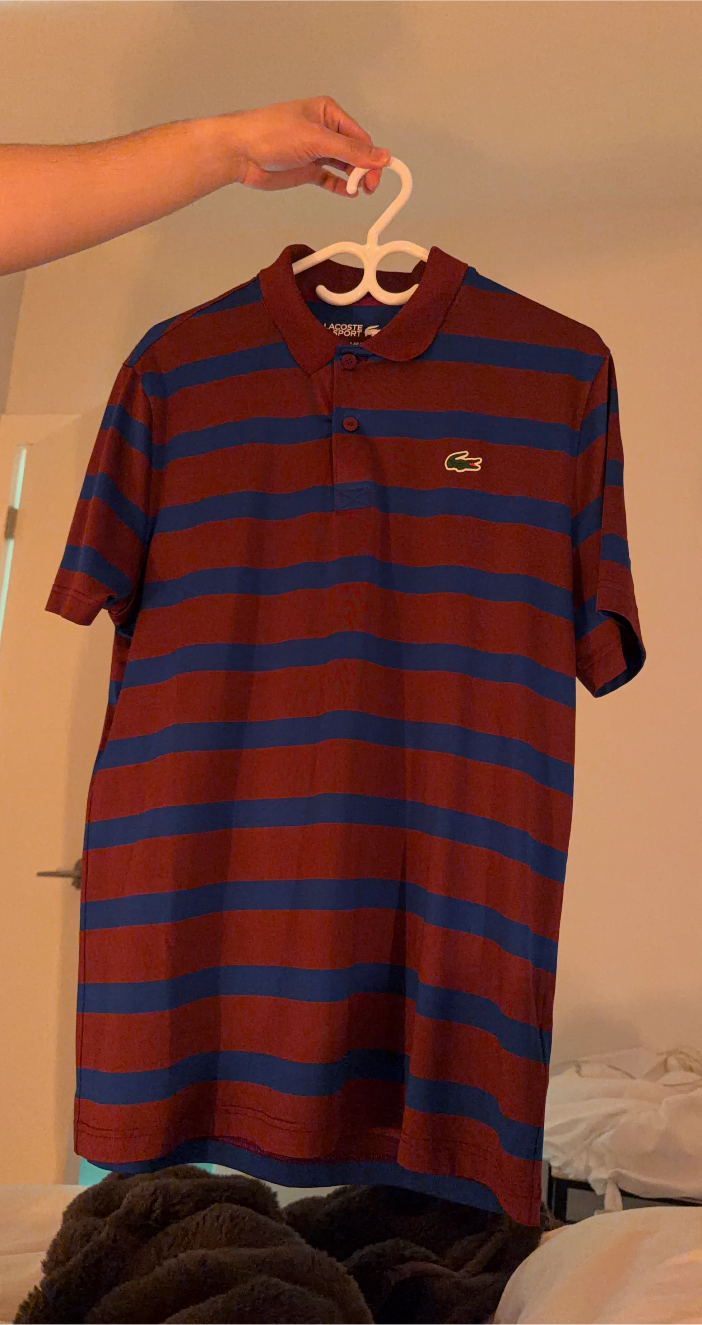 60Lacoste Sport polo shirt with a striped pattern in burgundy and blue. It's in great condition and ready for a new home!