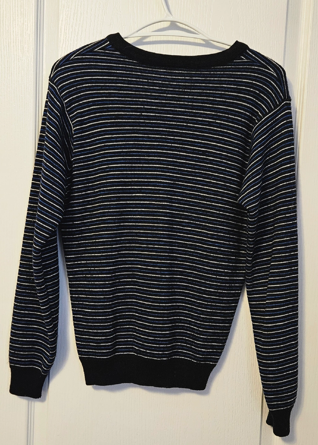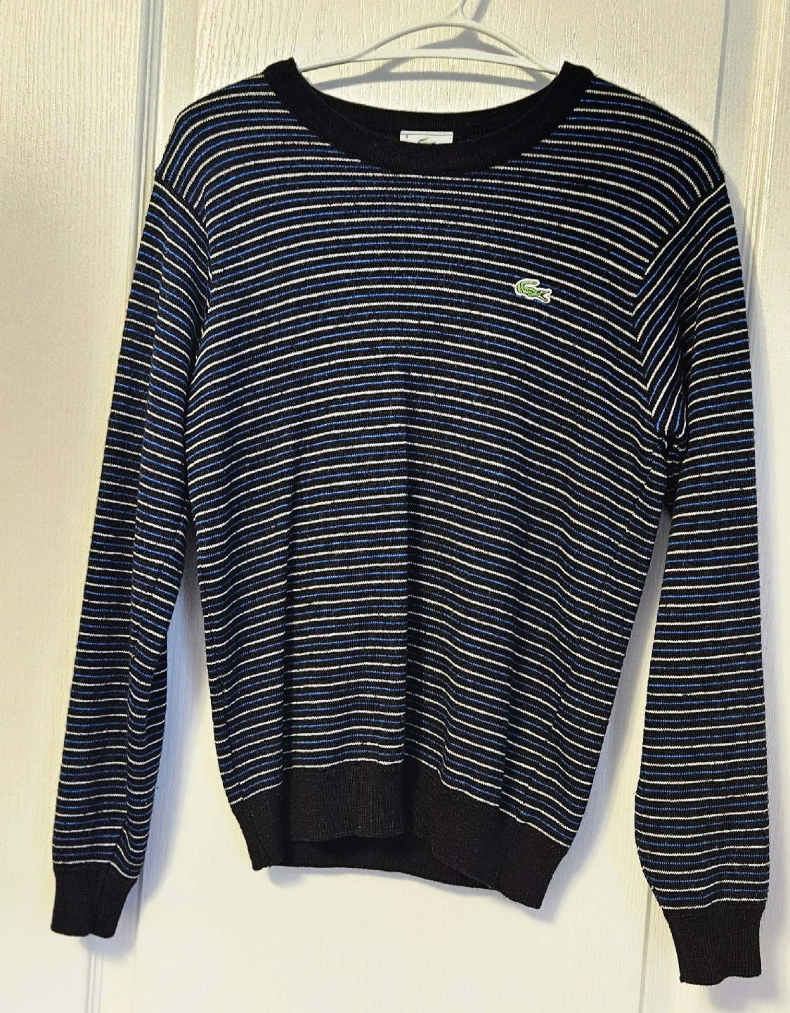 Cozy Lacoste sweater with a classic striped design! It's in excellent condition and perfect for layering. The knit material is soft and comfortable, making it ideal for everyday wear. The iconic Lacoste logo is subtly placed on the chest. A stylish addition to any wardrobe!