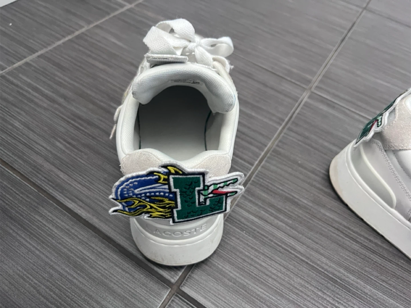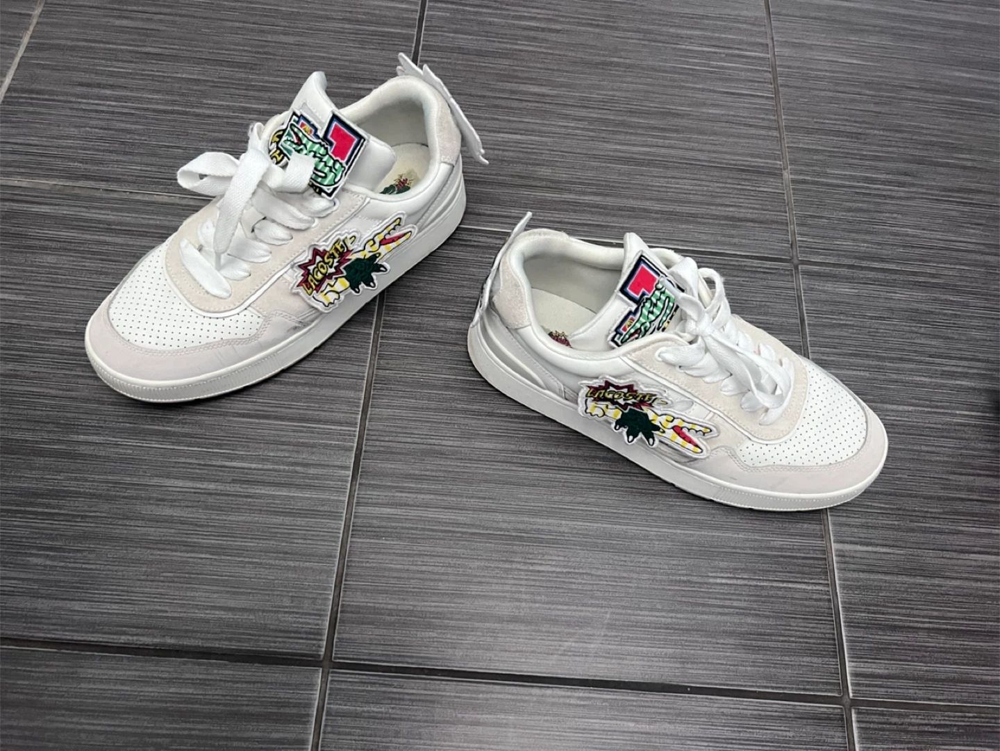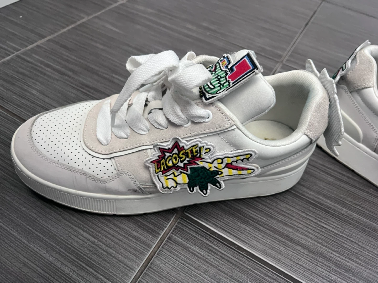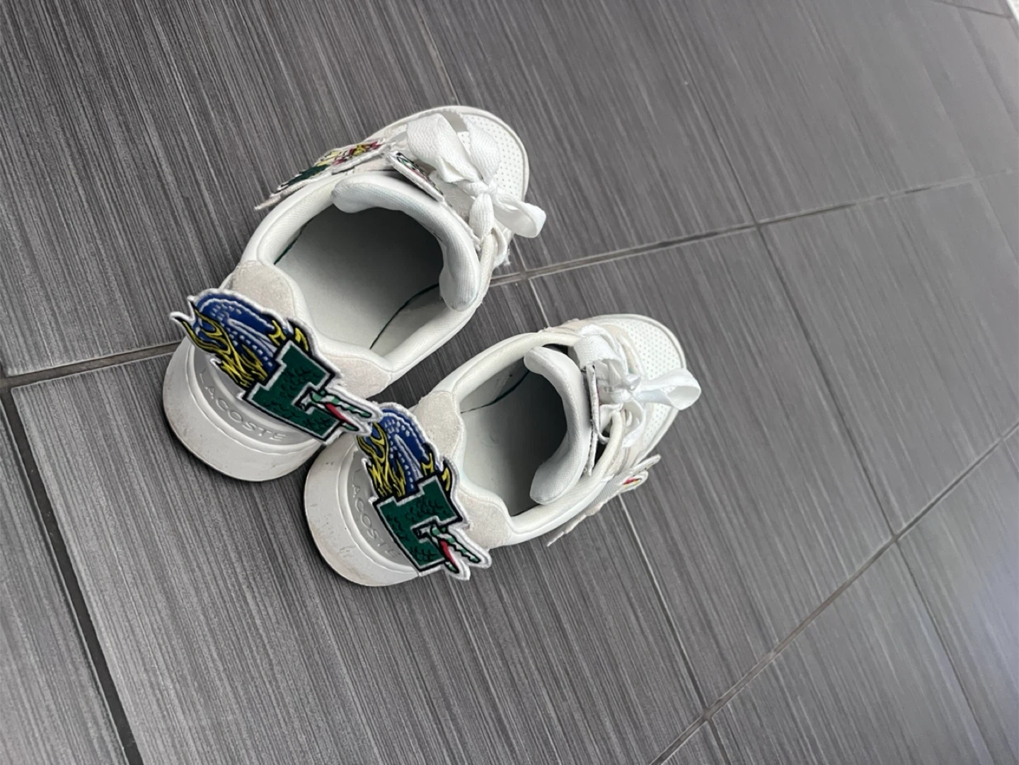 These are a pair of white Lacoste sneakers. They feature unique patches and detailing. The shoes are in good condition and ready for a new home!