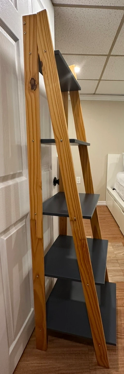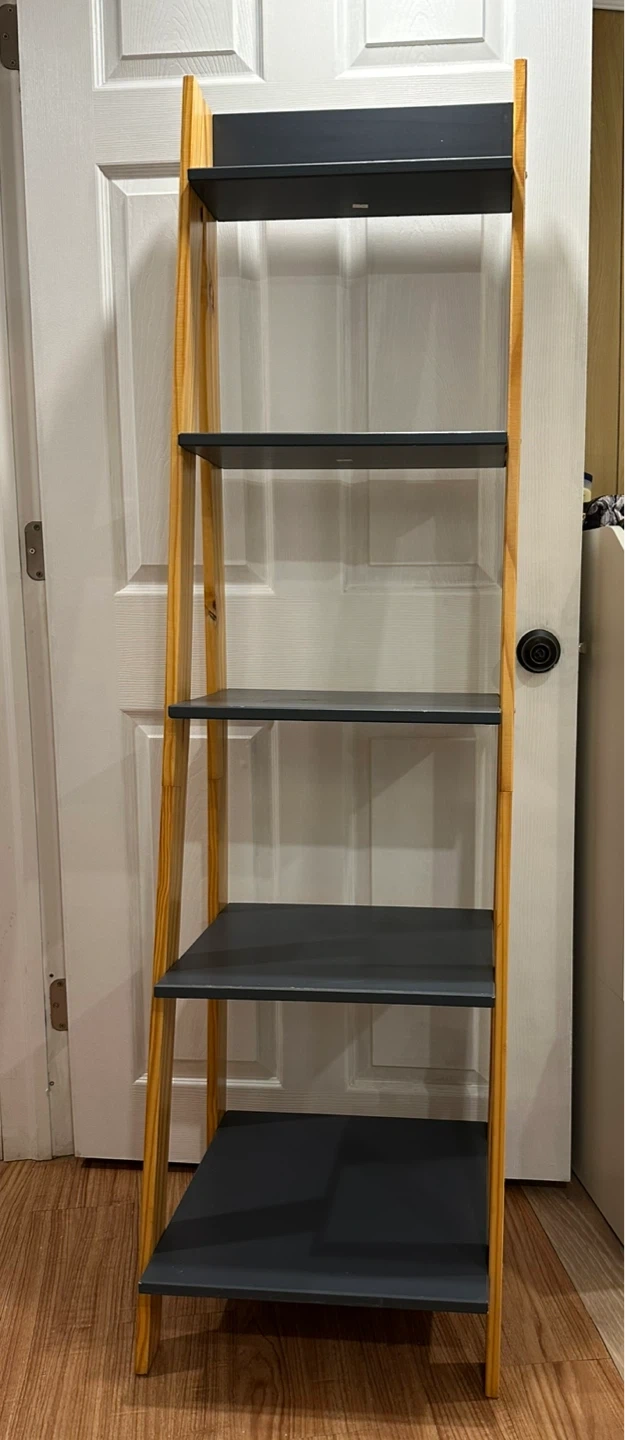 Ladder shelf with a wooden frame and grey shelves. It's in great condition and perfect for adding some storage and style to any room ✨