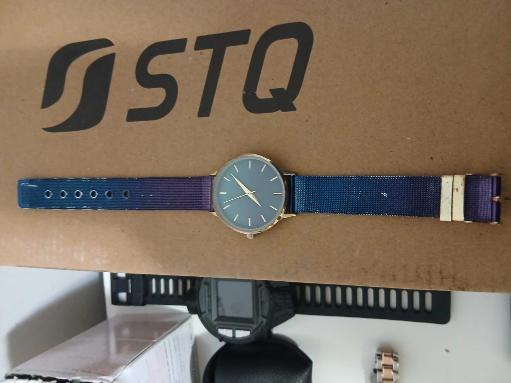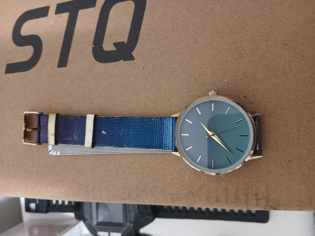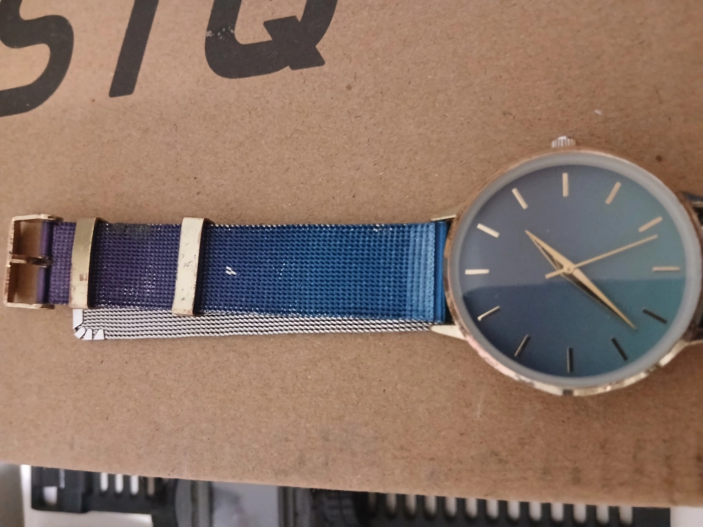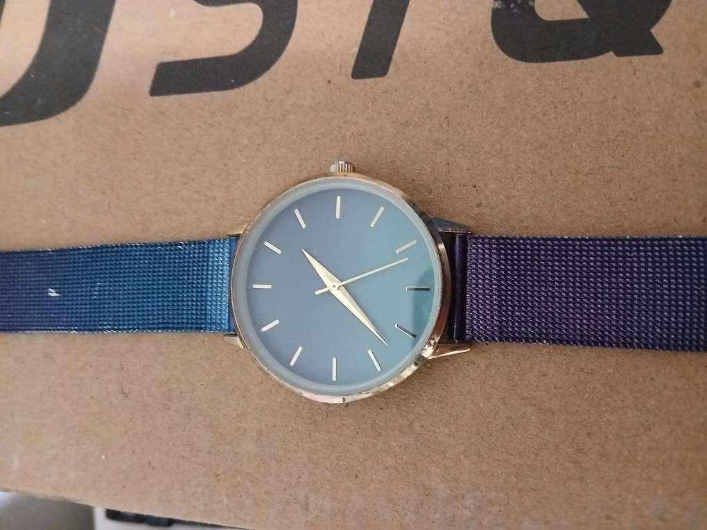Selling a ladies' fashion watch with a blue face and gold-tone case. The band has a unique gradient from blue to purple. It's a stylish accessory to add a pop of colour to your outfit!