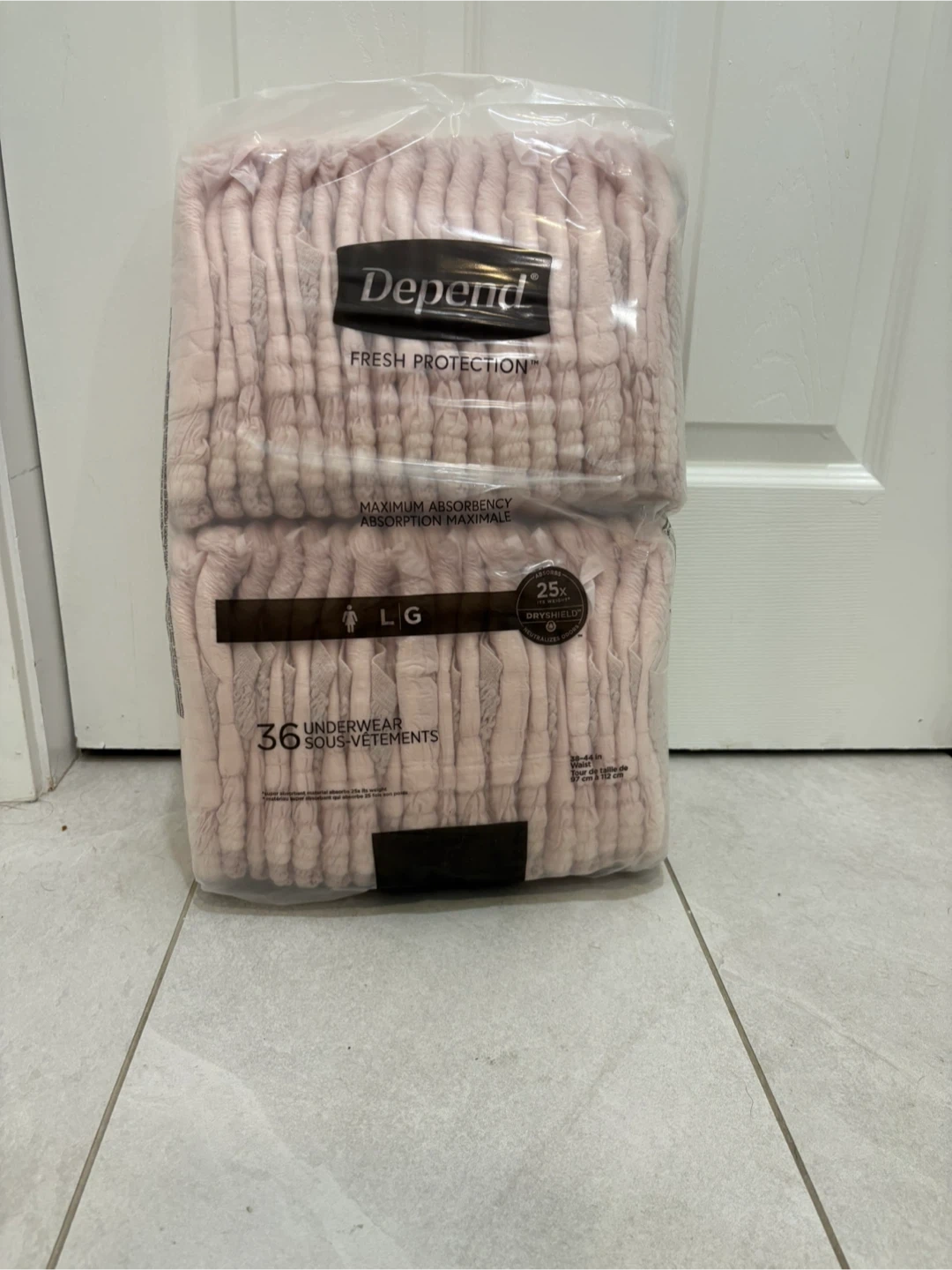 76Depend Fresh Protection underwear for ladies, size large. These are new in the original packaging. They provide maximum absorbency and have a comfortable fit. * Size: Large * Type: Underwear * Quantity: 36 per pack - * Features: Maximum Absorbency, Odour Control I'm decluttering and hoping someone can put these to good use. If the ad is up, they're available—no need to ask! Happy shopping! Will discount on multiple boxes
