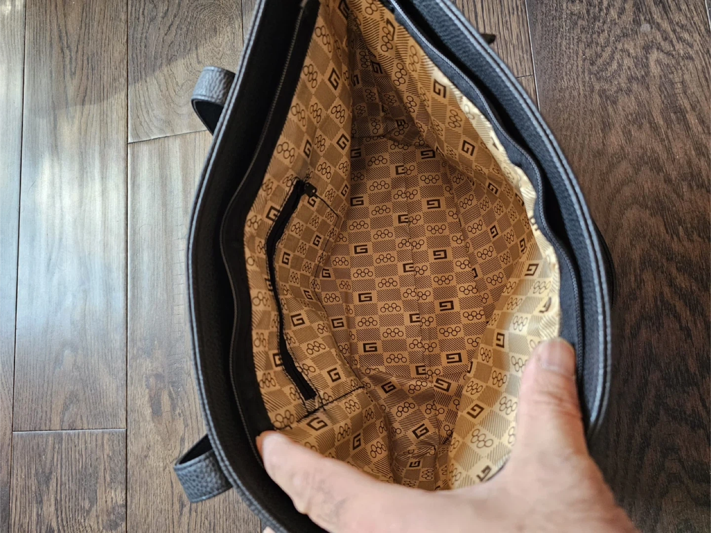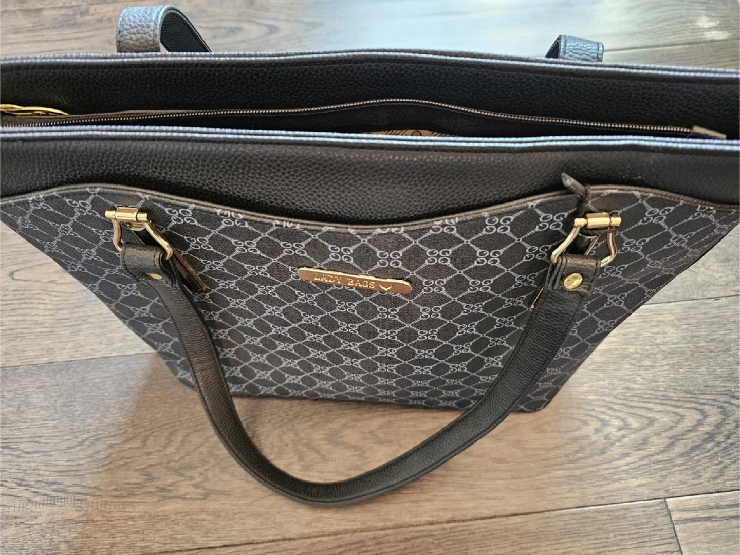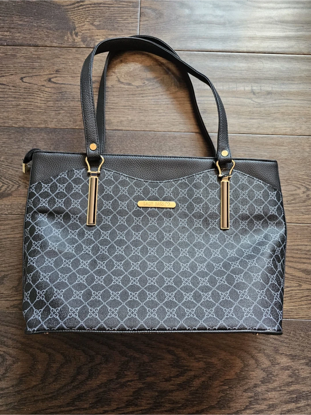 Selling a black tote bag from Lady Bags. It's in great shape and features a stylish pattern on the exterior. The interior lining has a unique design as well. Perfect for everyday use!