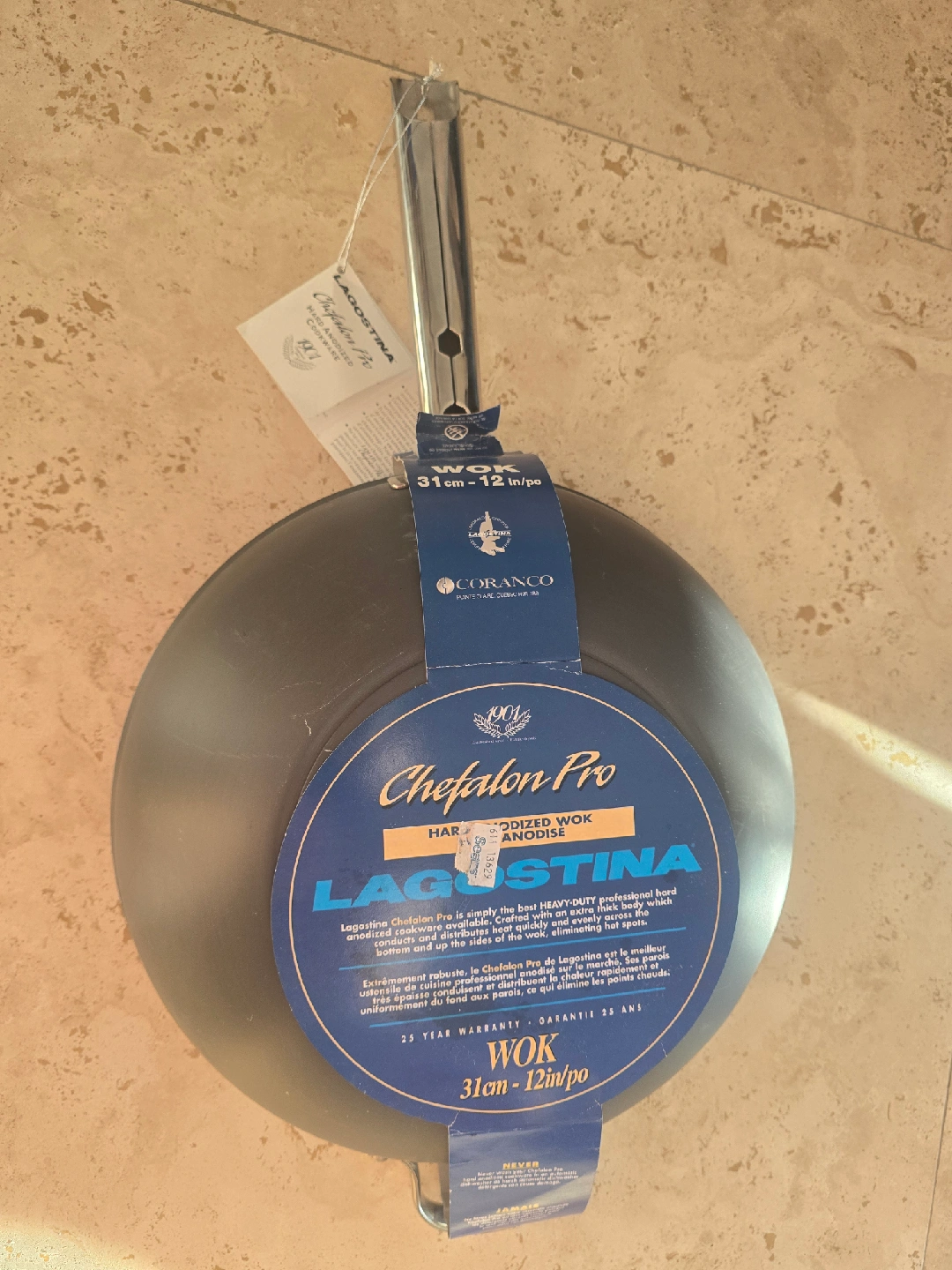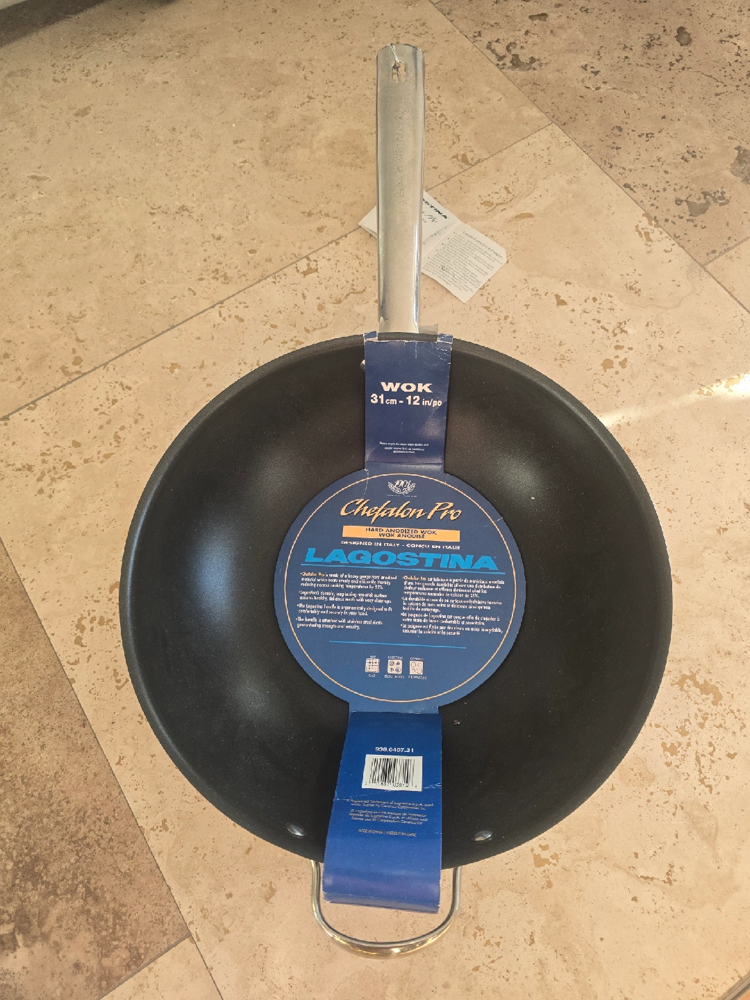 Selling a Lagostina Chefalon Pro hard anodized wok! It's a heavy-duty professional wok crafted with an extra-thick body. The wok conducts and distributes heat quickly and evenly across the bottom and up the sides, eliminating hot spots. It's 31cm or 12 inches in diameter. It also comes with a 25 year warranty!