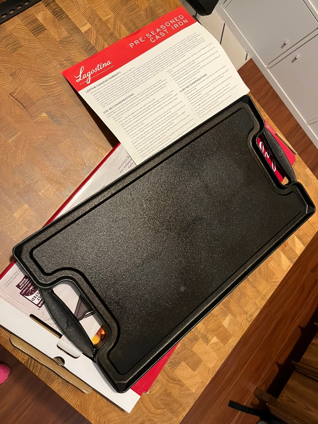 I'm selling a Lagostina pre-seasoned cast iron reversible grill and griddle. Taken out of the package once, and never used - Reversible grill/griddle - Heavy gauge construction is warp resistant, safe for oven or barbeque use and on all cooktops including induction - Raised edges prevent spilling and deep grooves help channel away dripping away from food for healthy cooking - Dimensions are 50.5 cm x 27 cm / 20 in x 10.5 in - Oven and BBQ safe