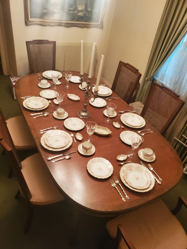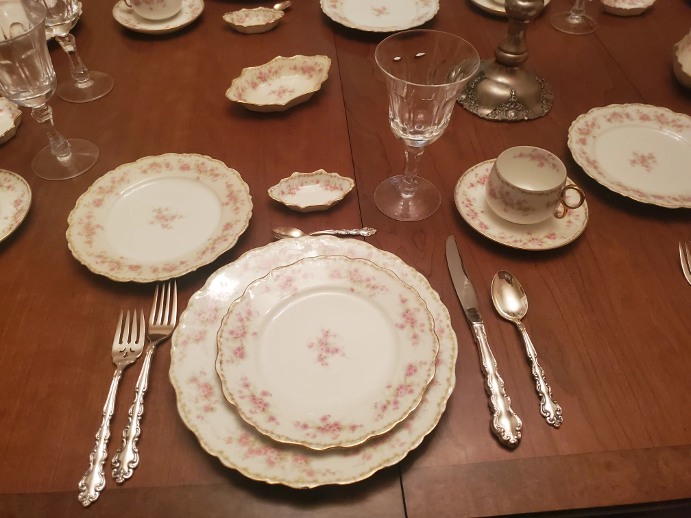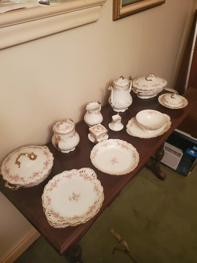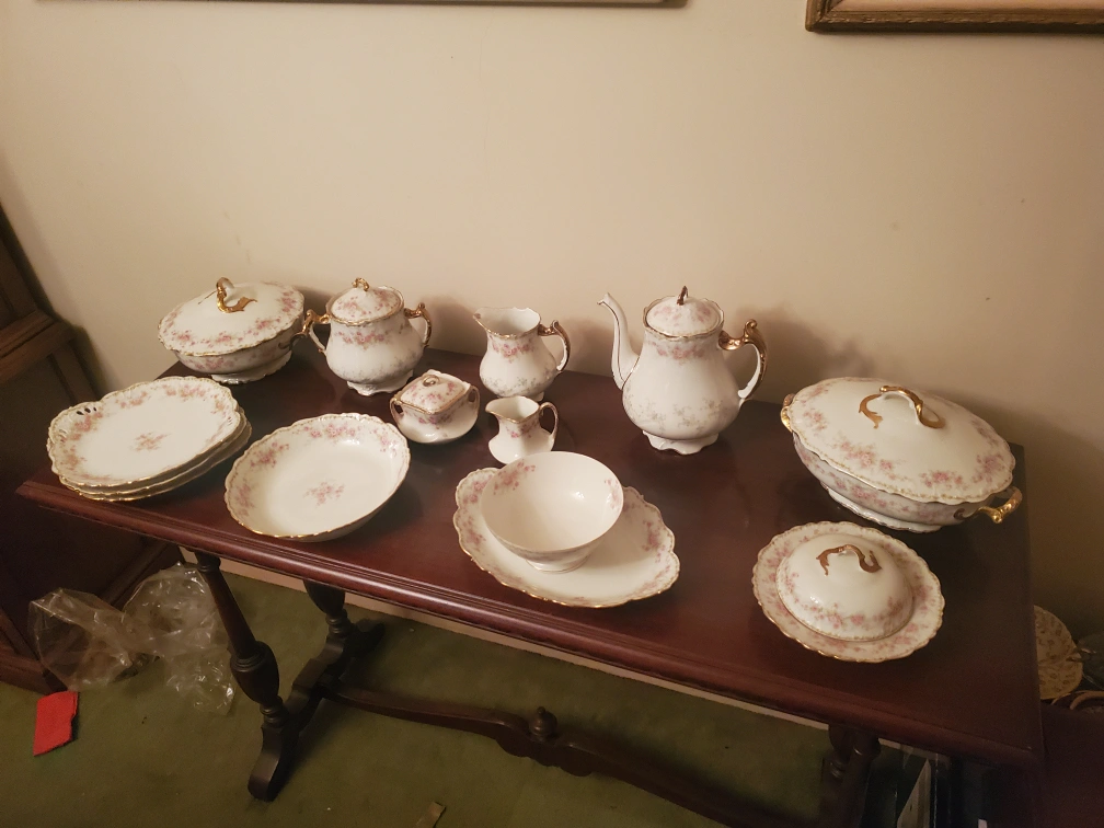 This is a beautiful vintage dinnerware set with a delicate floral pattern. It includes plates, bowls, cups, saucers, and serving dishes. Perfect for adding a touch of elegance to your dining table!