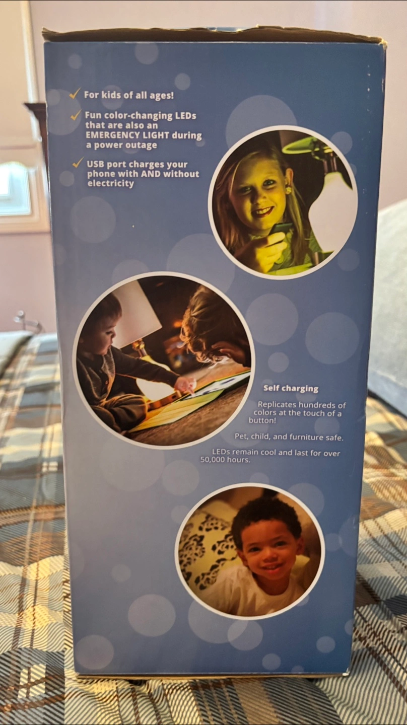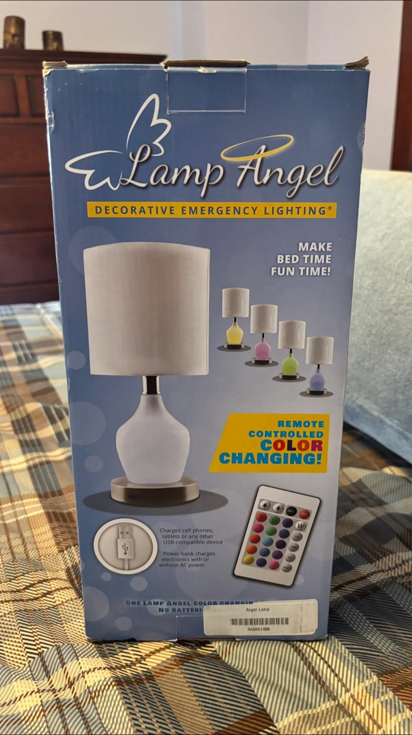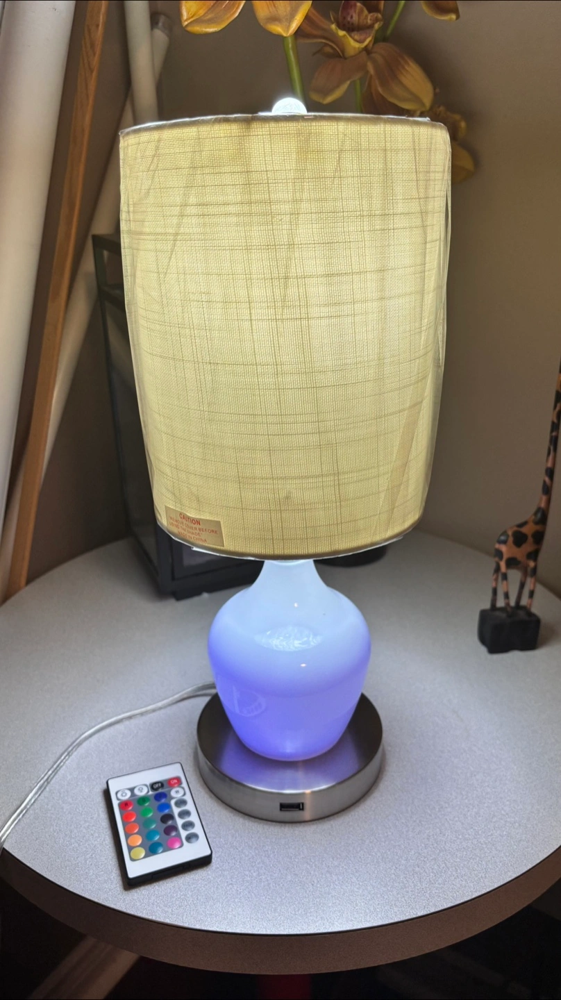 10Decorative lamp, with a white shade. The lamp is white, and has a silver base, with a remote. It is perfect for creating a relaxing atmosphere in a child's room.