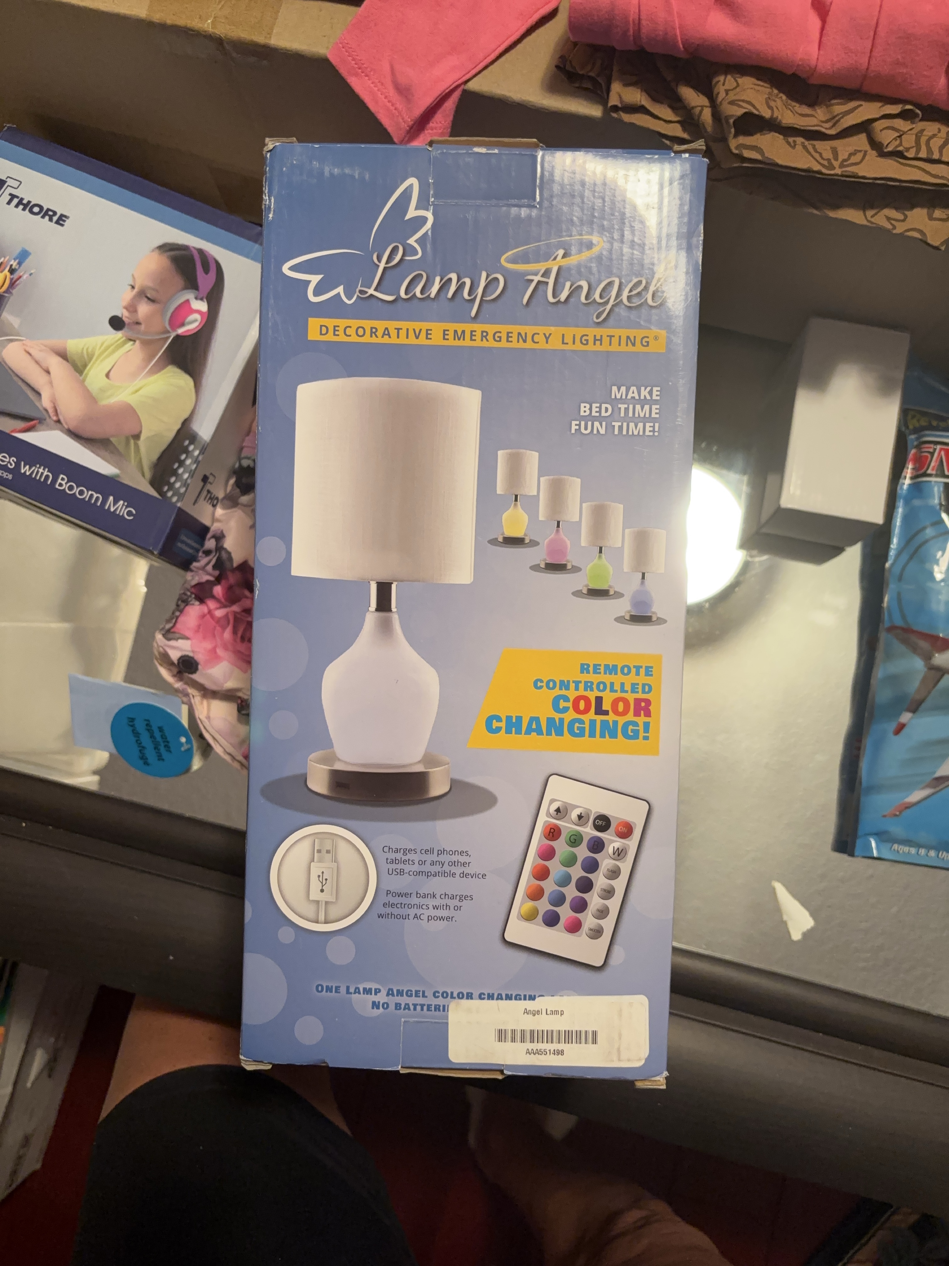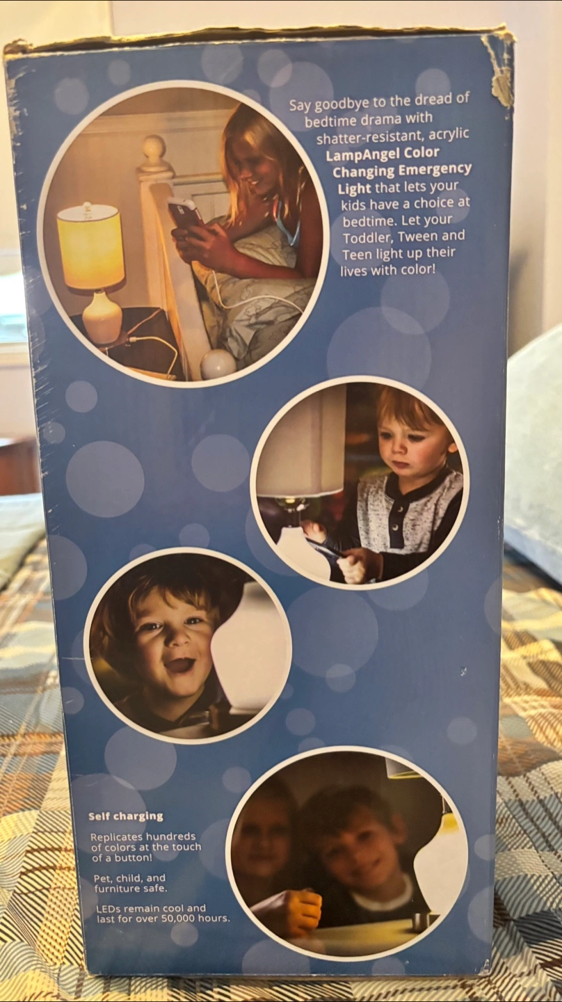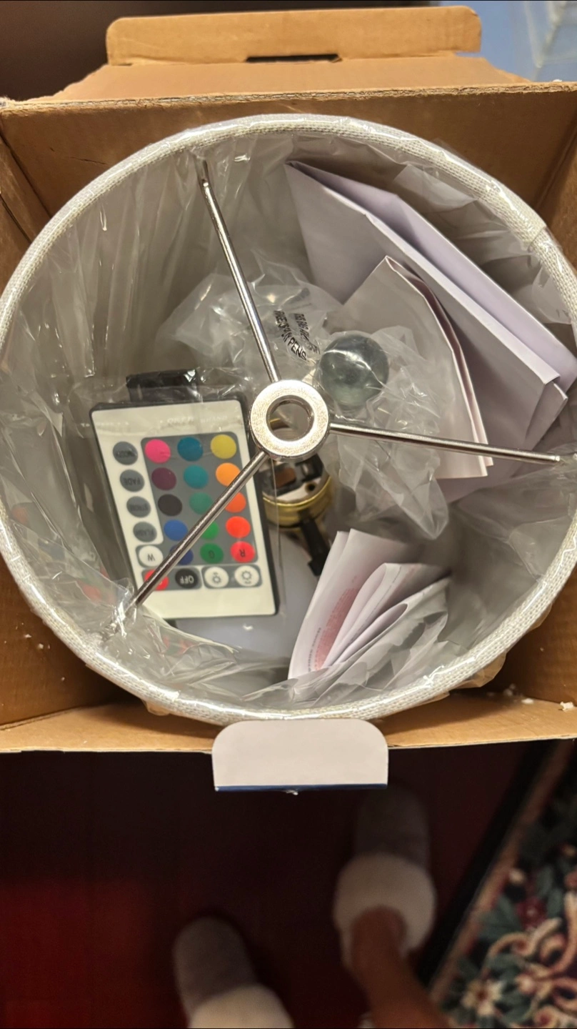 10Decorative lamp, with a white shade. The lamp is white, and has a silver base, with a remote. It is perfect for creating a relaxing atmosphere in a child's room.