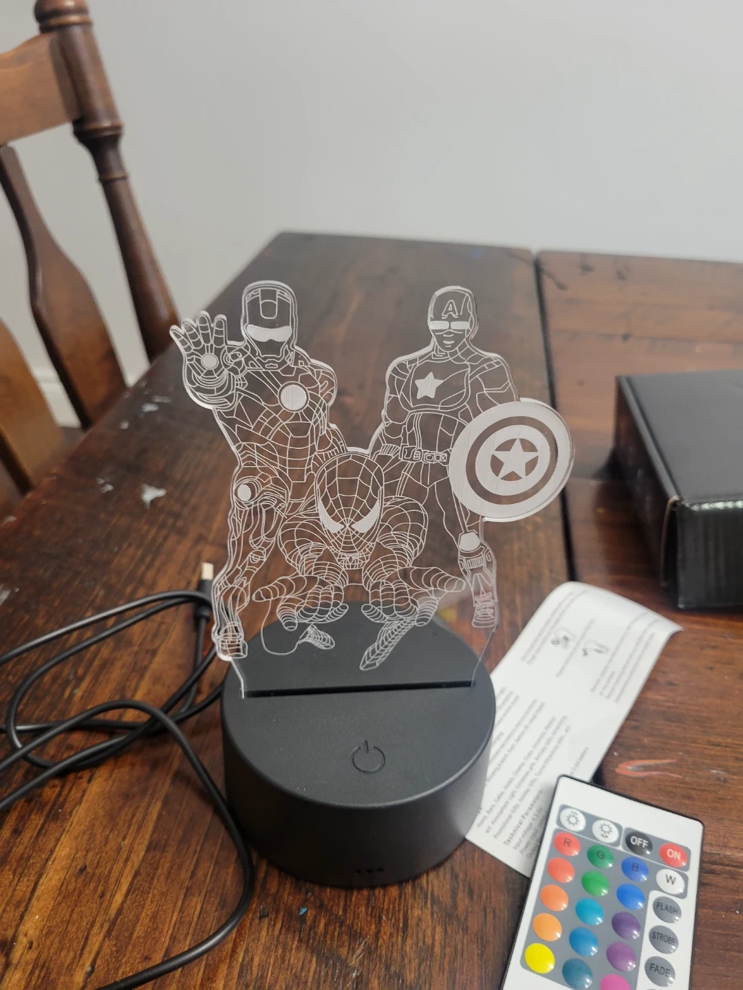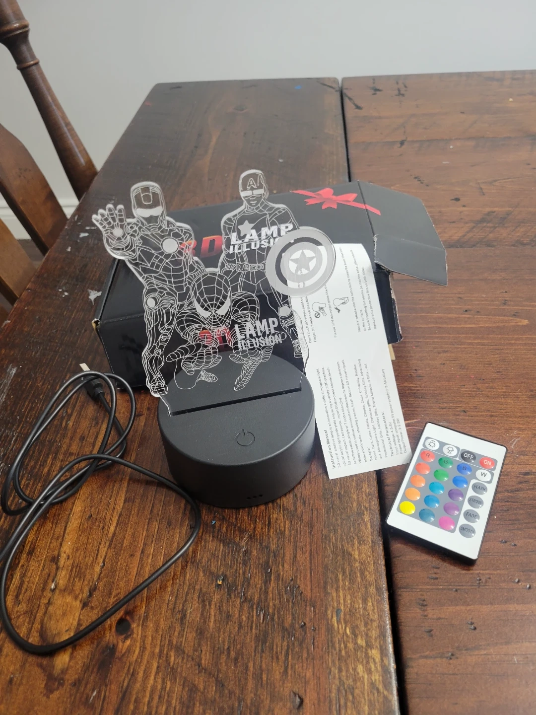 107Selling a Lamp Illusion LED night light featuring Marvel heroes! It comes with a remote control, USB cable, and touch switch. The lamp is battery operated and comes with the box and instructions
