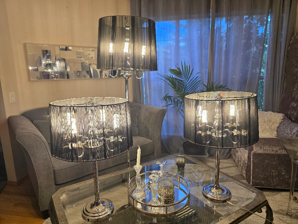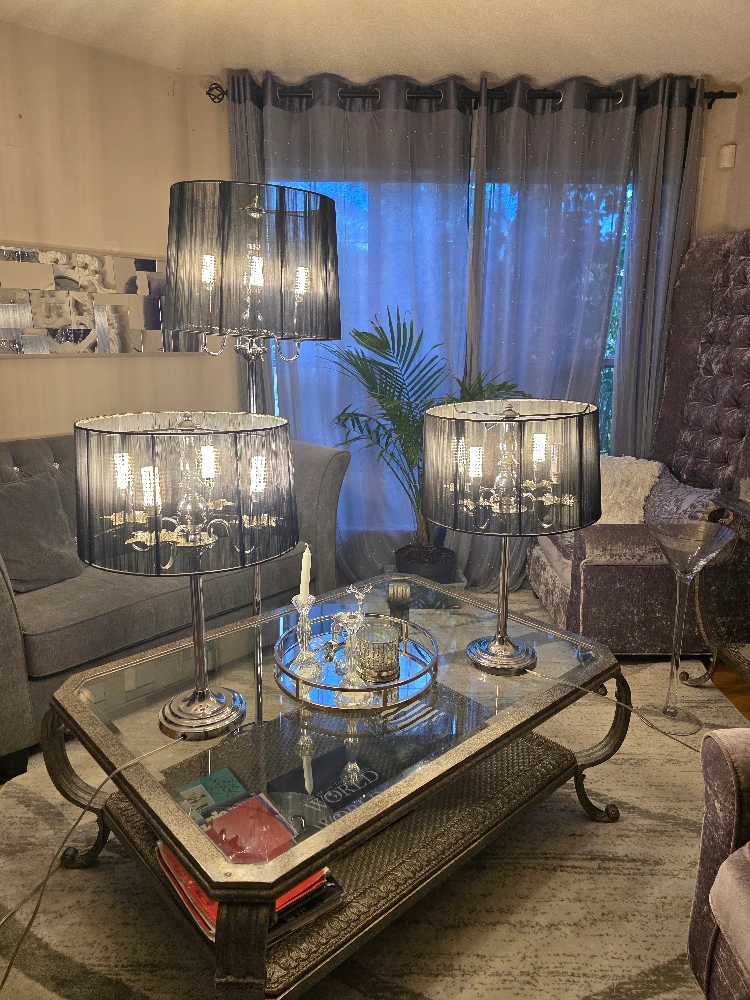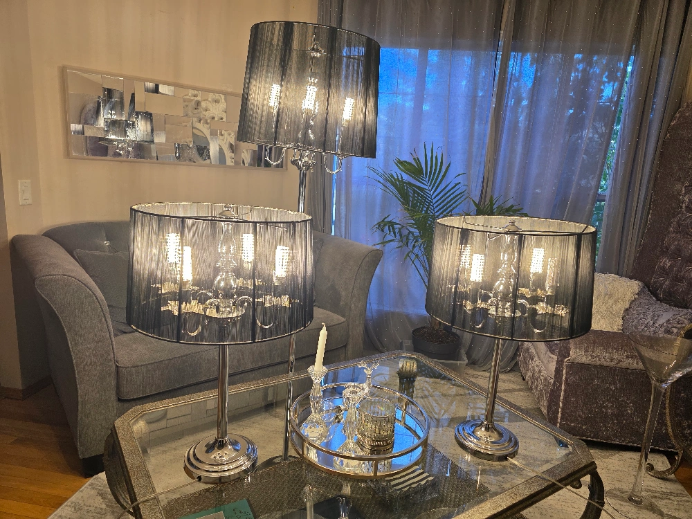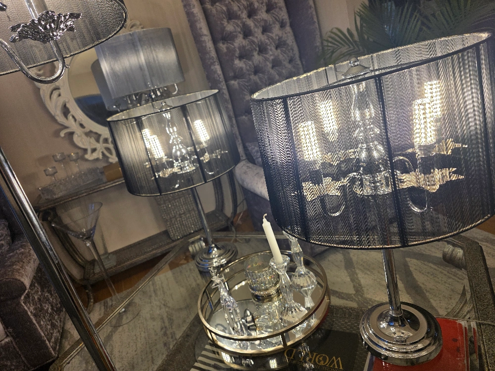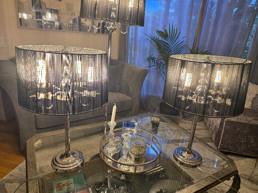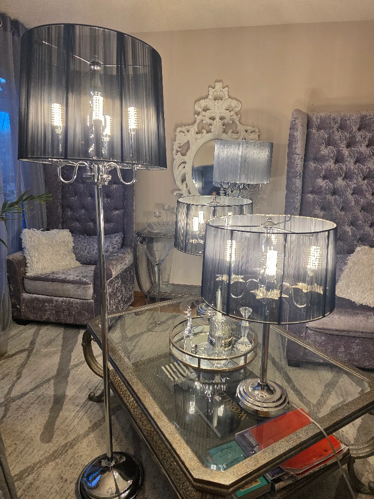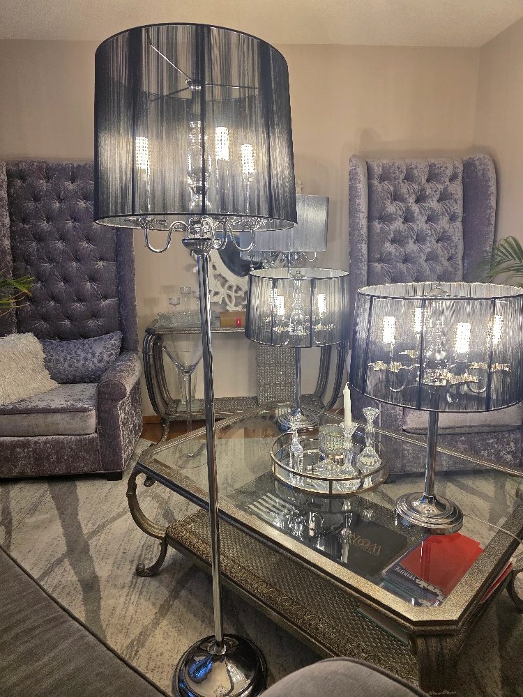 Selling a set of lamps, including two table lamps and a floor lamp! They feature a stylish design with a mesh-like shade and chrome finish. Perfect for adding a touch of elegance to any room