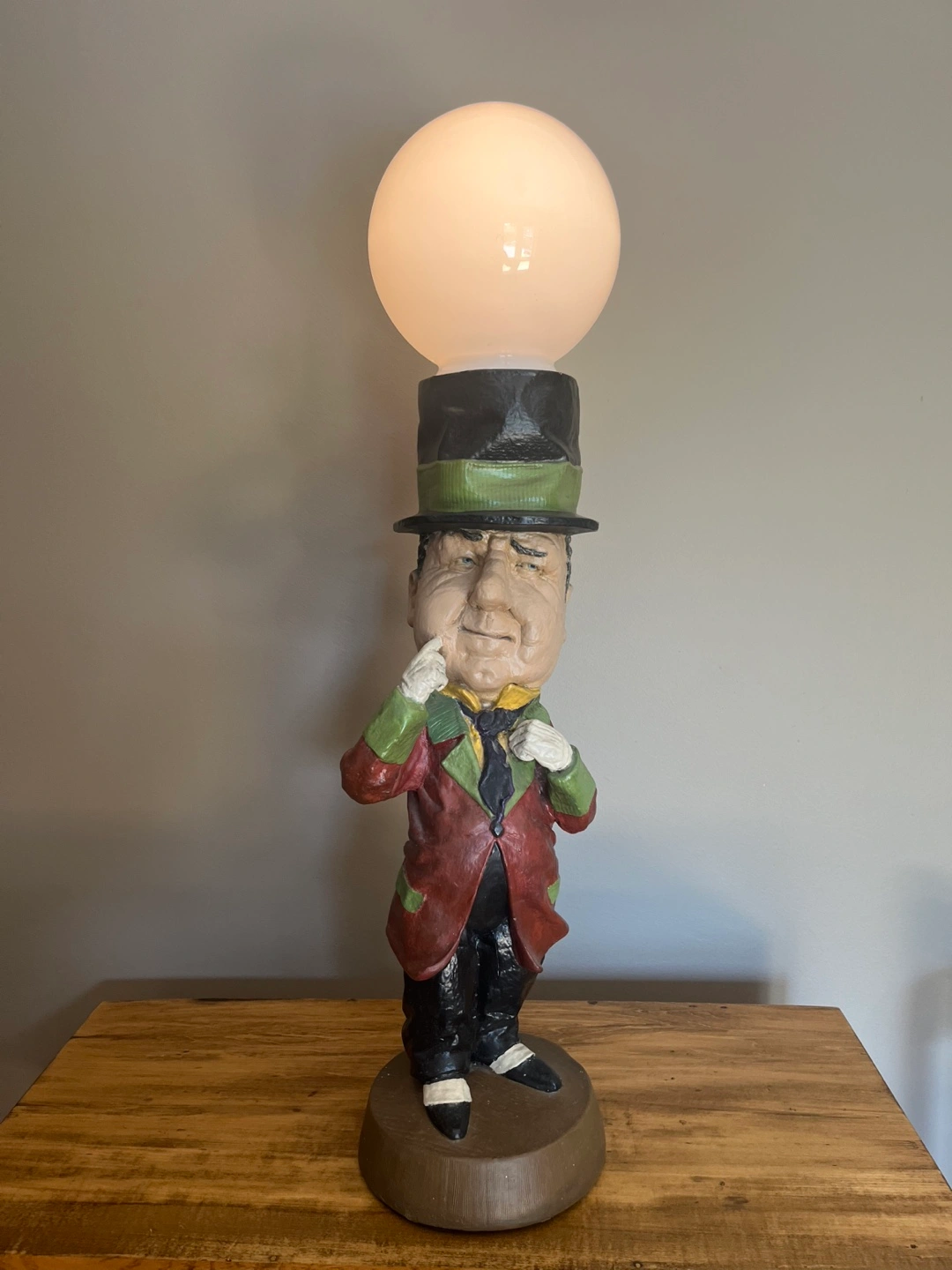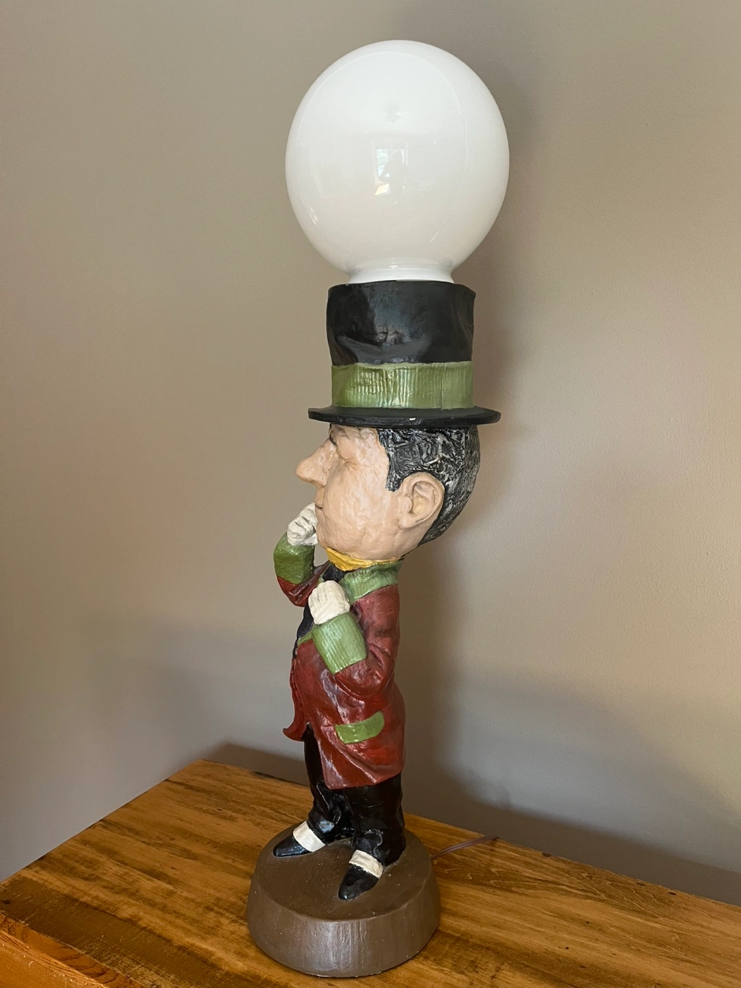 Vintage W.C. Fields globe lamp from the 1970s. It’s been in my family since new and is in excellent condition with no chips or cracks etc and the light still functions perfectly as well. It’s made of heavy duty moulded plastic and is very heavy weighting 30 plus pounds. It’s hand painted with oils and water colours that really enhance the features of this once classic actor and comedian. It’s 33 inches in height with a 8 inch round circumference base. This is a very well looked after piece that is very unique and rare that would enhance any room in your house plus it’ll make for a terrific conversation piece.