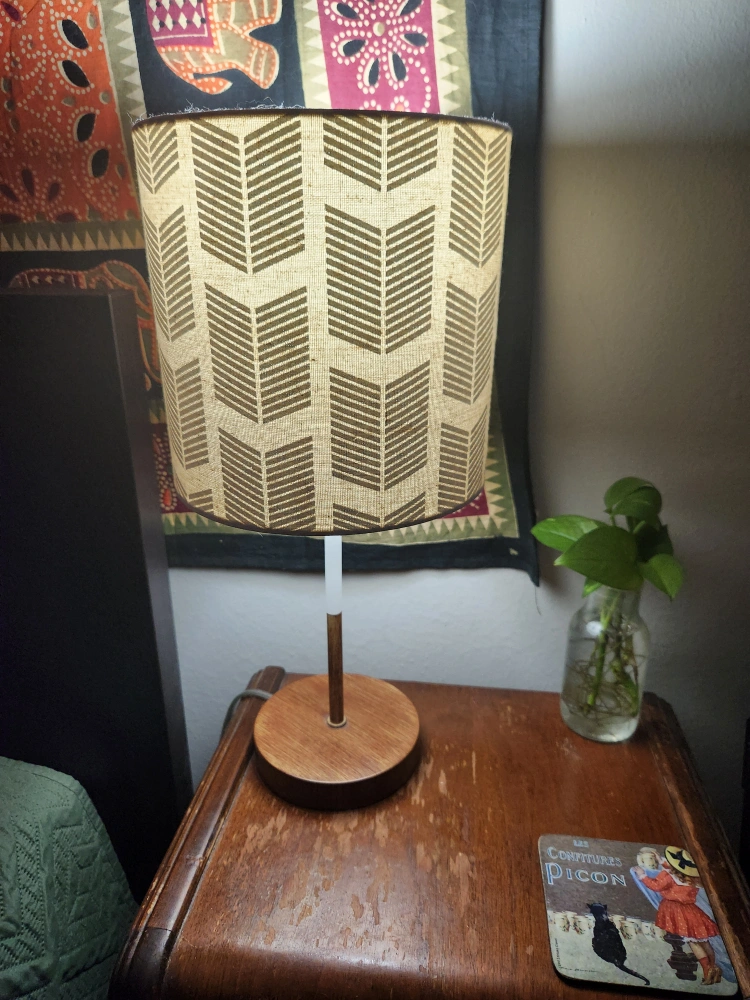 619Table lamp with geometric fabric shade. Wooden base, bulb included