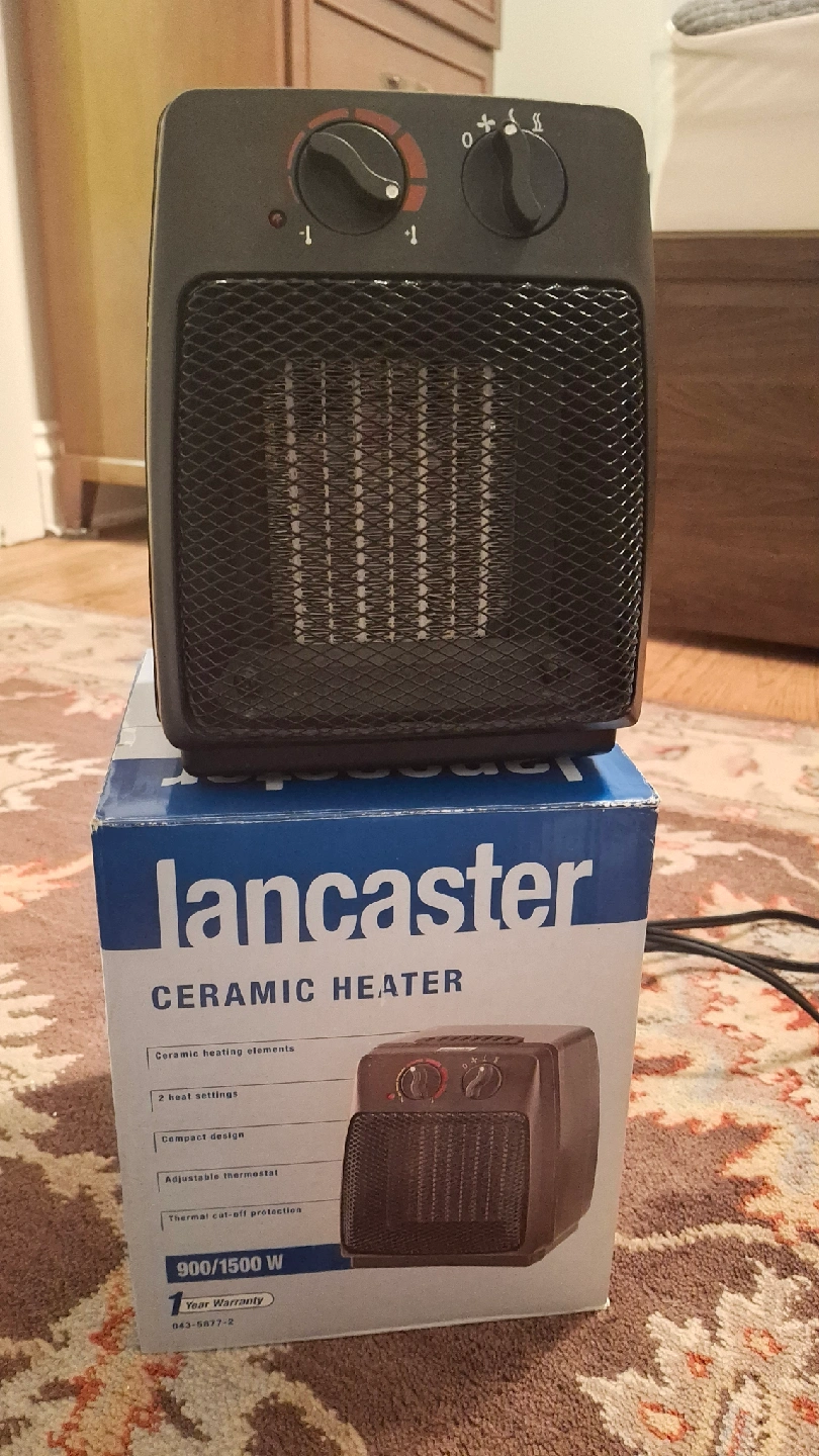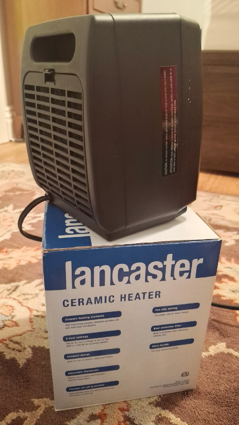 Selling a Lancaster ceramic heater. It features ceramic heating elements and provides safe and even heat distribution. It also has 2 heat settings, an adjustable thermostat, and thermal cut-off protection. The heater is compact in design and includes a carry handle for easy portability pick up location 1615 Dundas Street east. Toronto
