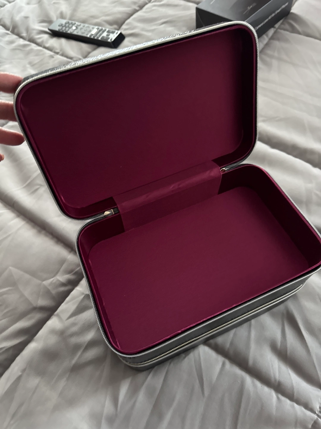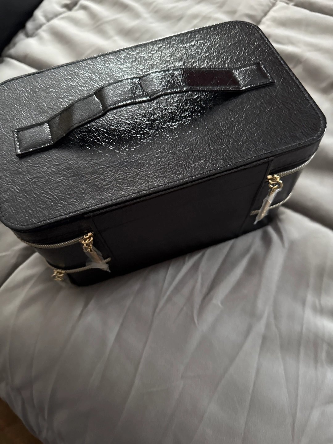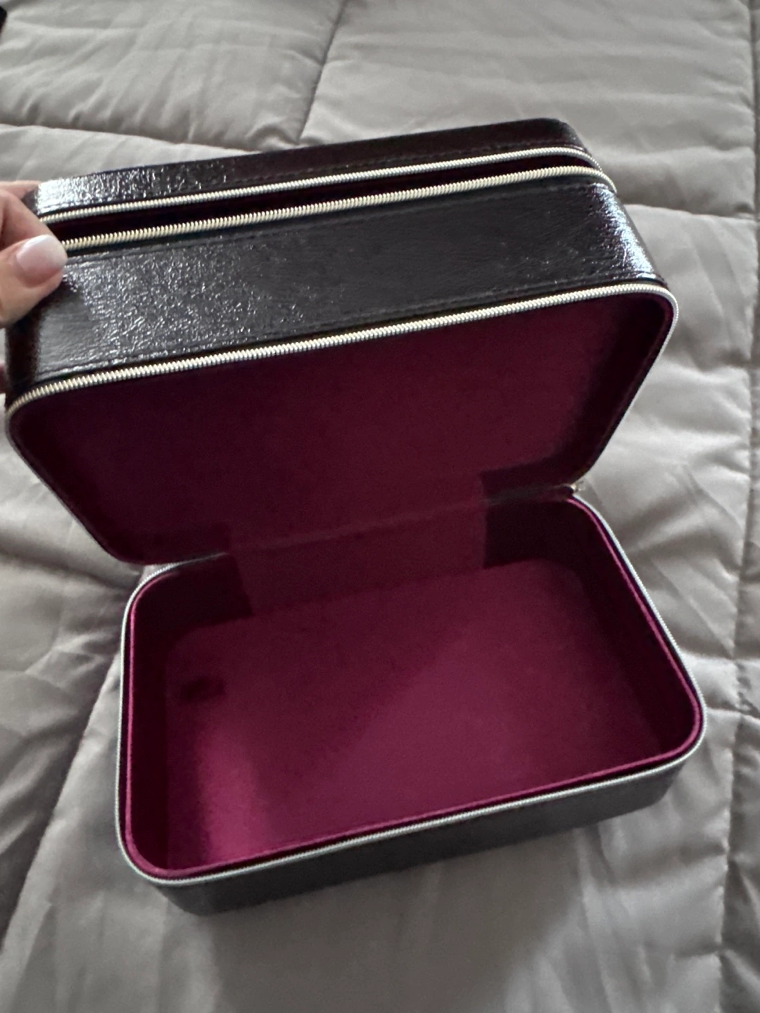 Selling a Lancome makeup/cosmetic bag. It's black with a shiny finish on the outside and a deep pink interior. Great for storing your beauty essentials! Has 2 compartments