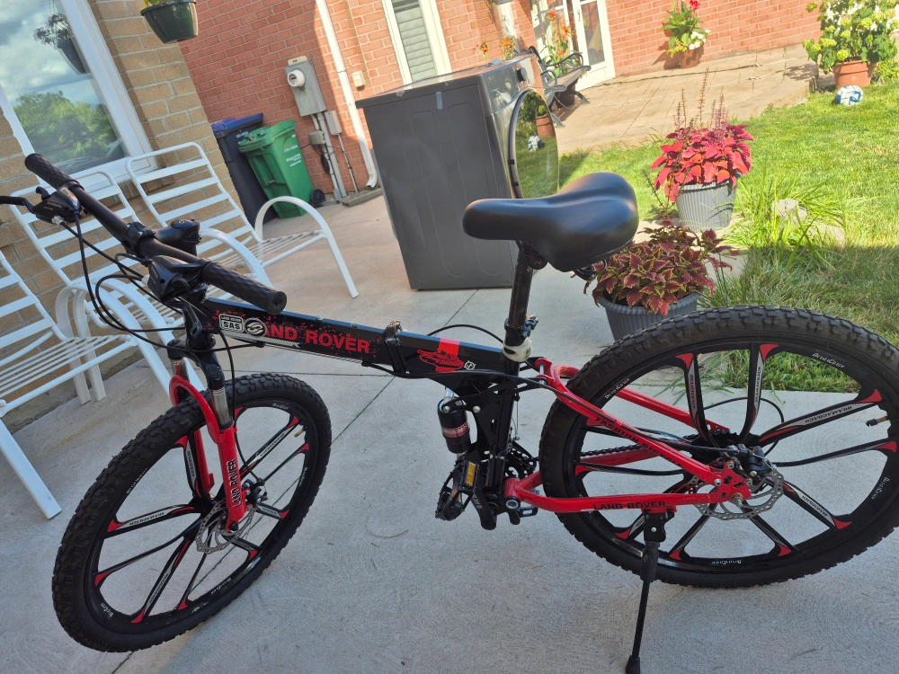 Selling a Land Rover folding mountain bike in red and black. It's a great bike for those who need something that can be easily stored or transported. Perfect for city commutes or weekend adventures! size 26. can negotiate because one brake handle is broken.