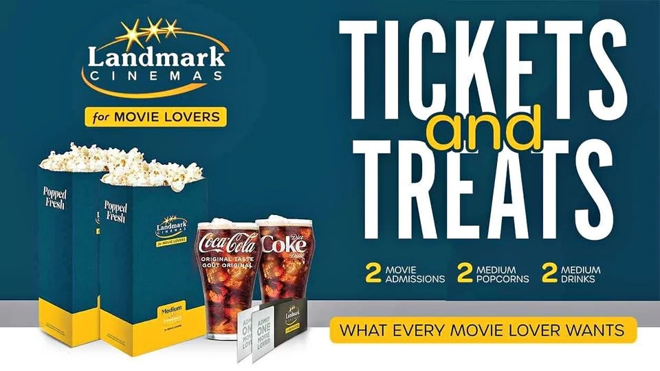 AVAILABLE FOR PICK UP ONLY COMES WITH: - 2 Adult Movie Tickets to any Landmark Cinemas - 2 Medium Popcorns - 2 Medium Fountain Drinks - 1 bagged candy