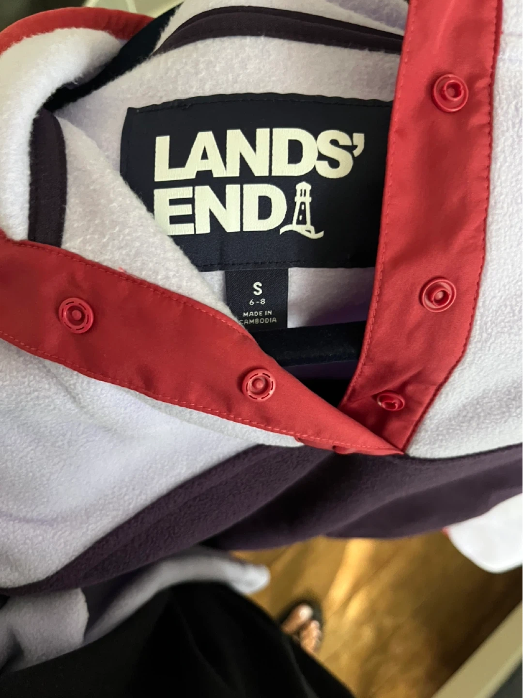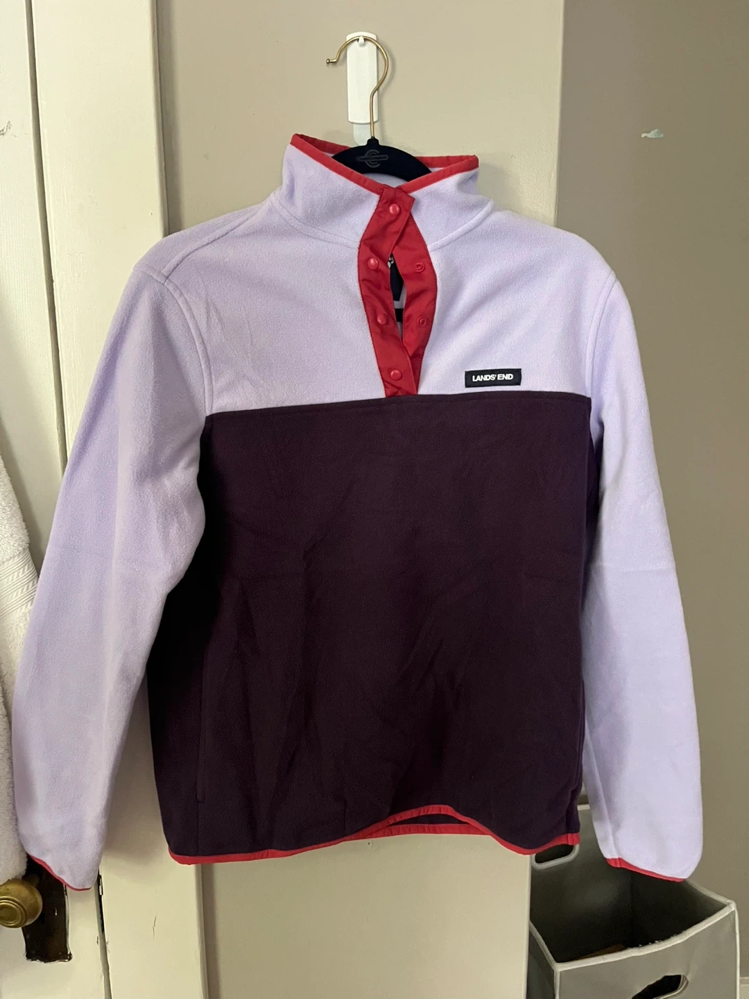 15Cozy Lands' End fleece pullover with snap buttons a quarter of the way Size small Features a unique purple colour way Condition like new