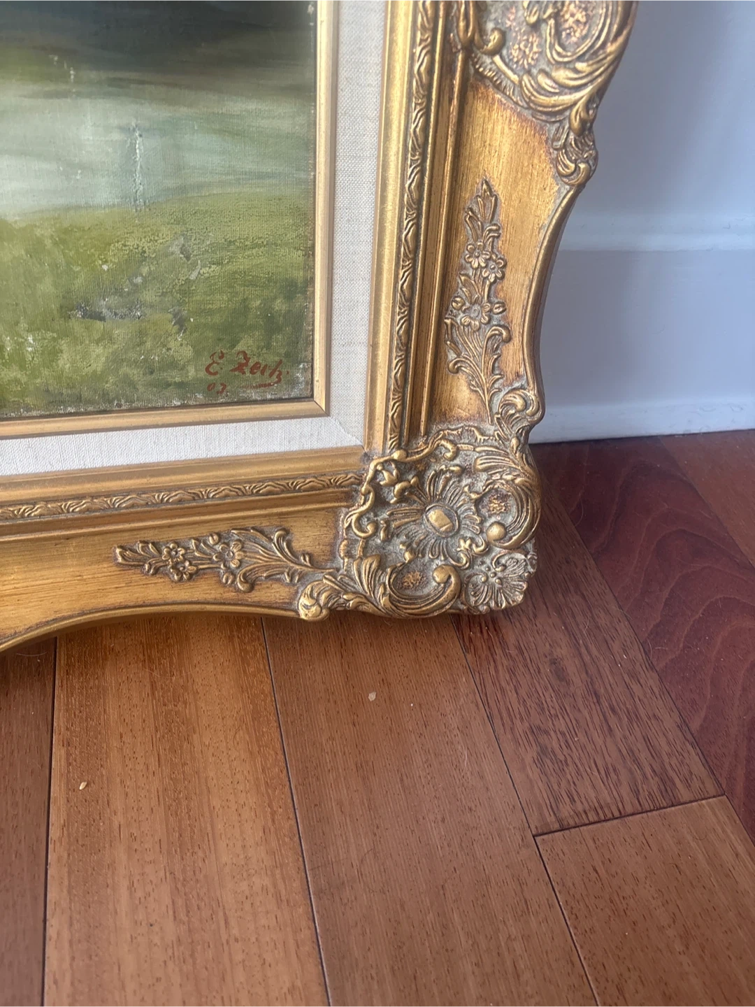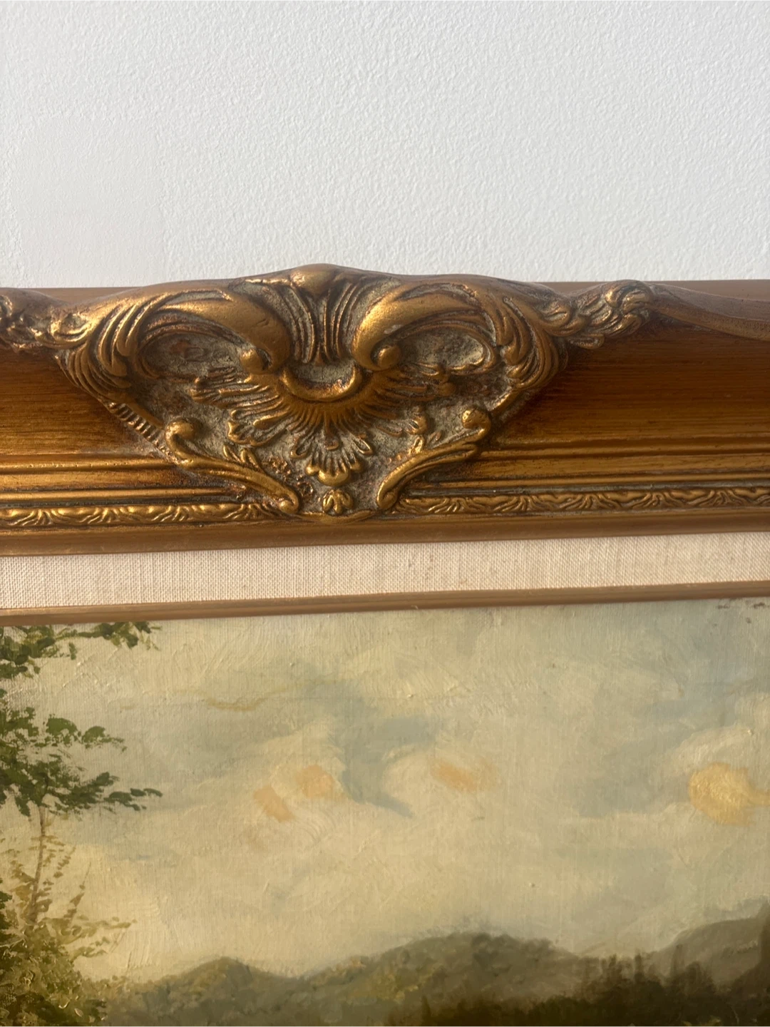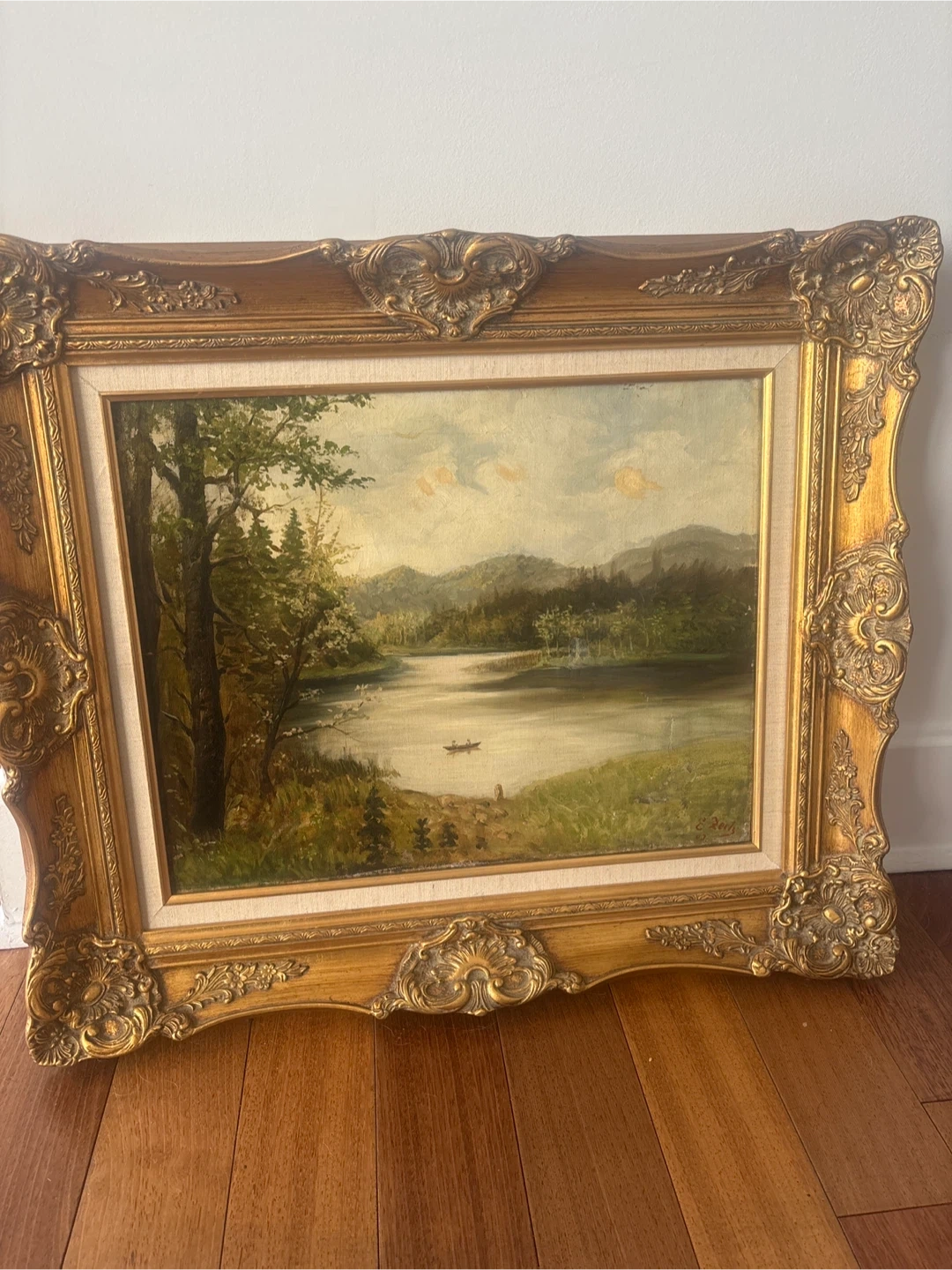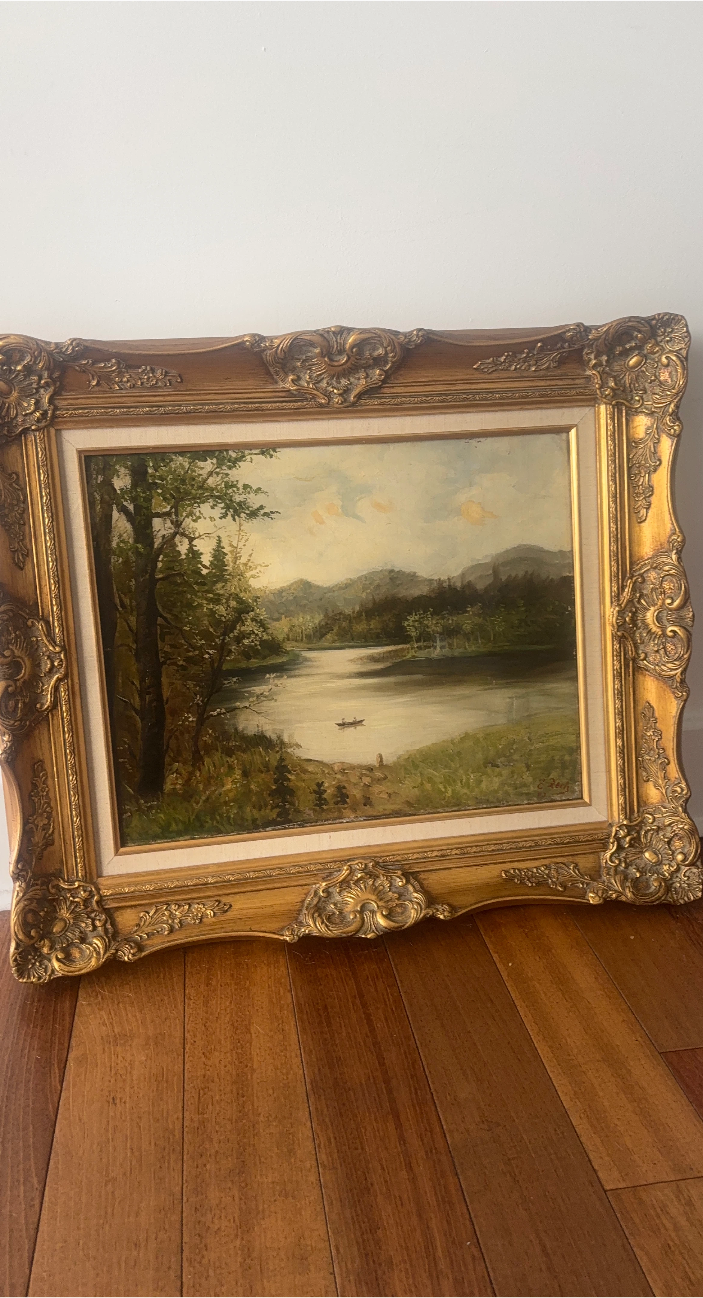Selling a framed landscape painting with a beautiful ornate golden frame. The painting depicts a serene lake and mountain scene. It is signed E. Reich.