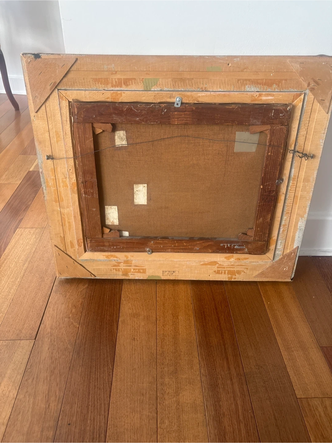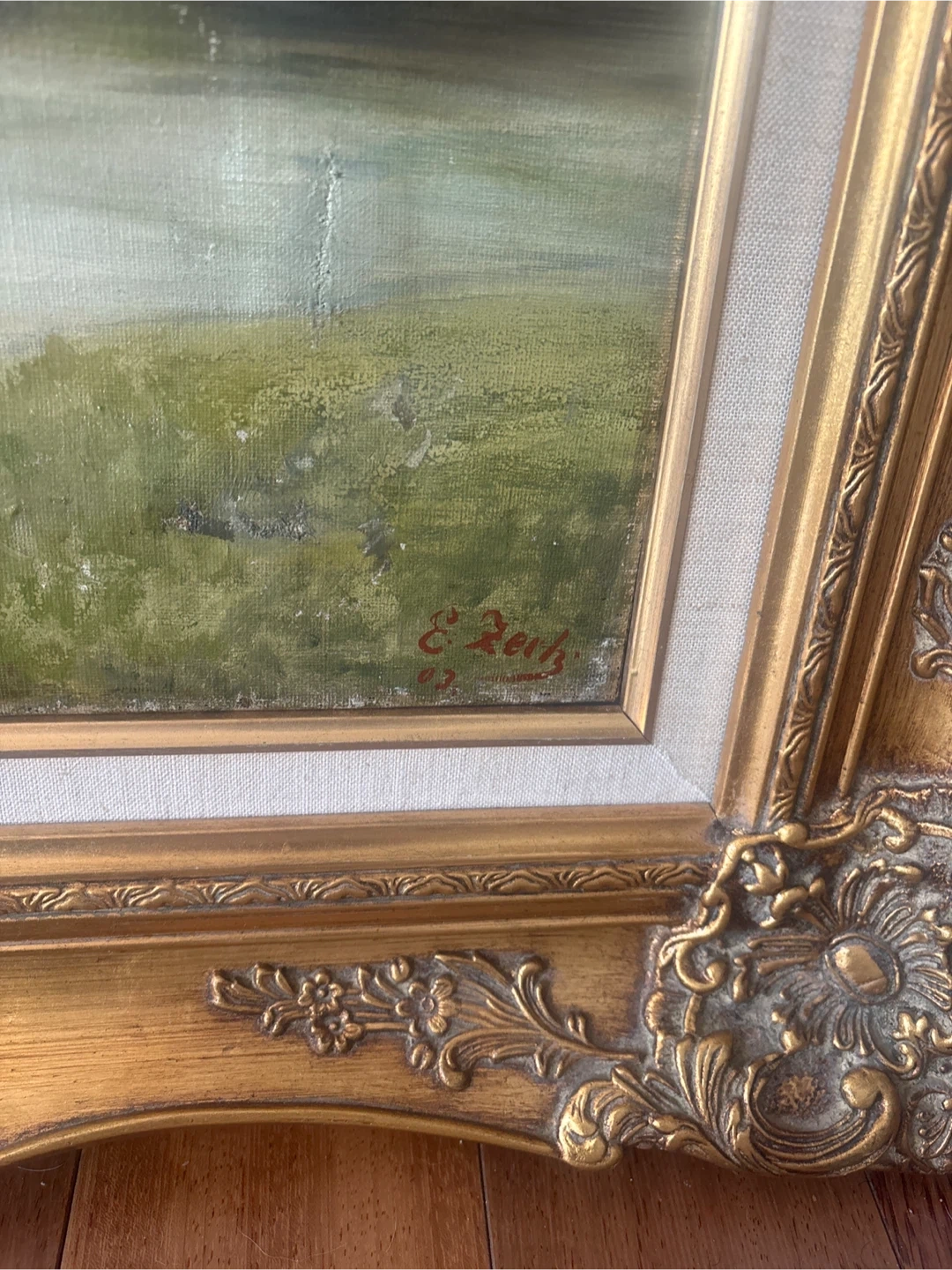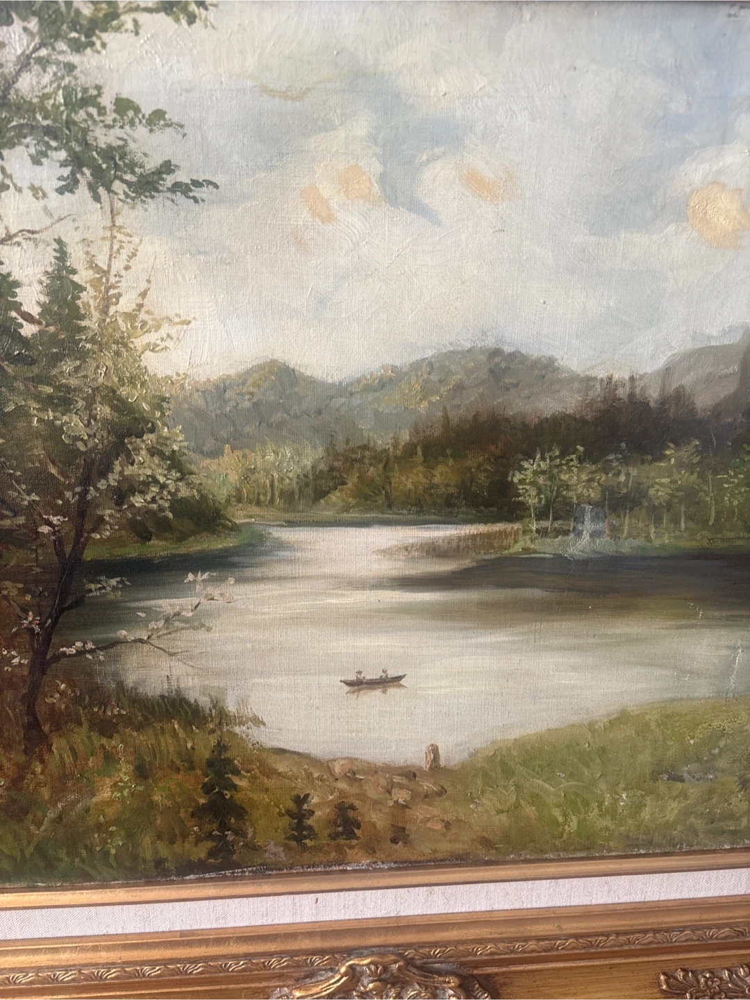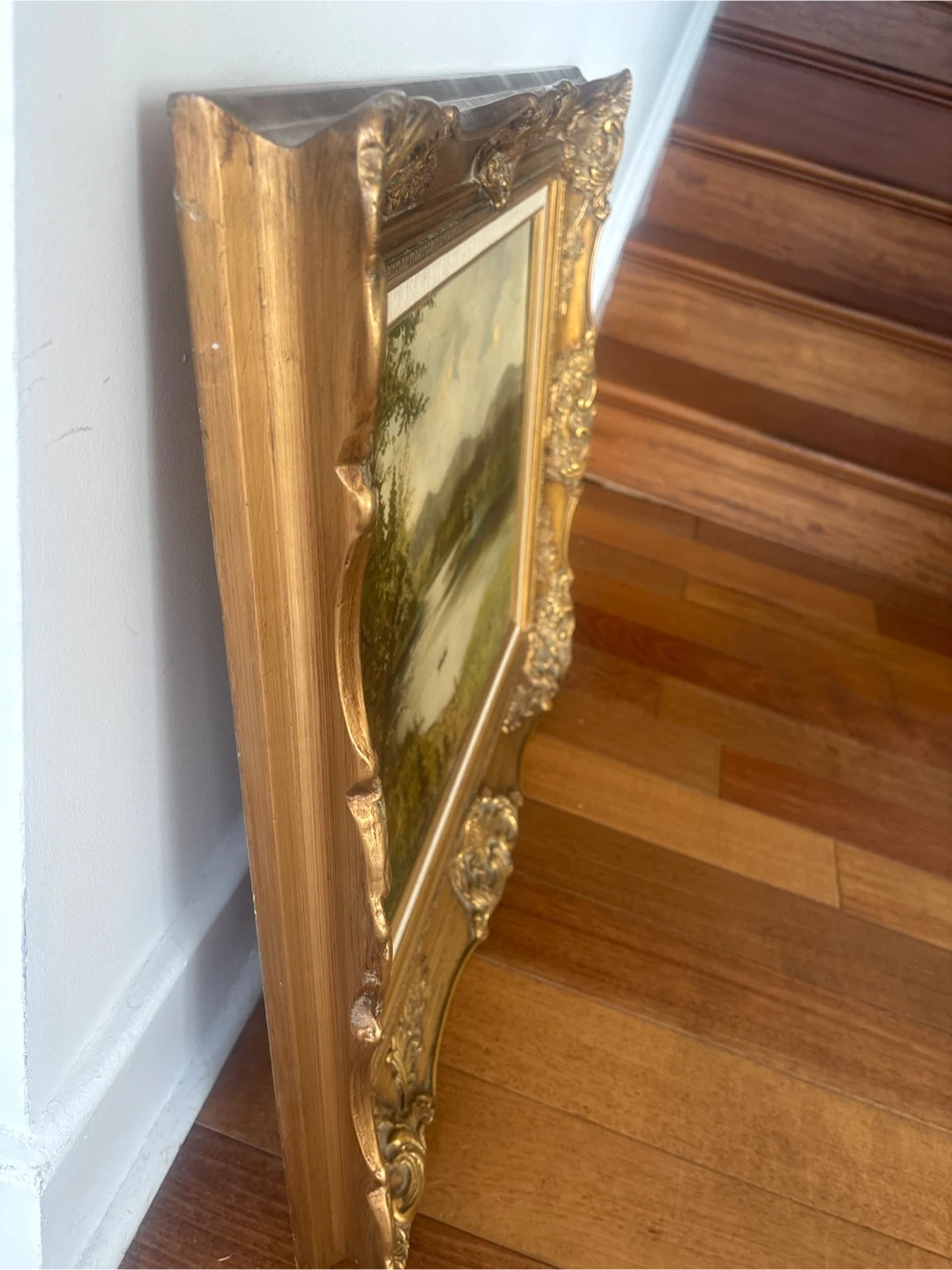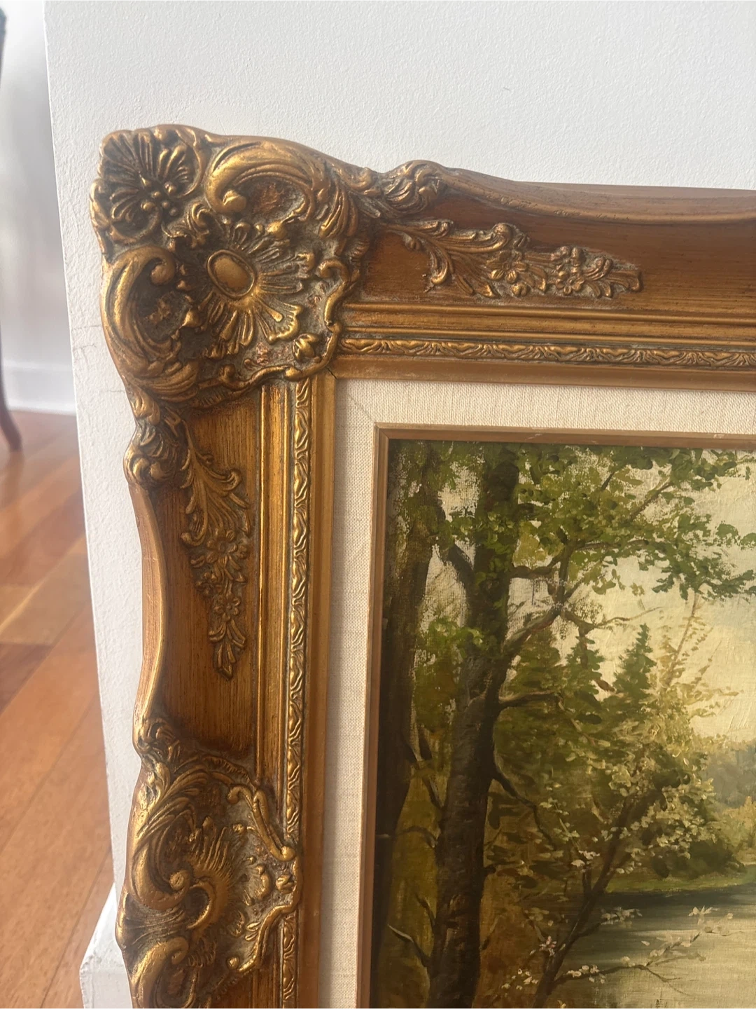 Selling a framed landscape painting with a beautiful ornate golden frame. The painting depicts a serene lake and mountain scene. It is signed E. Reich.