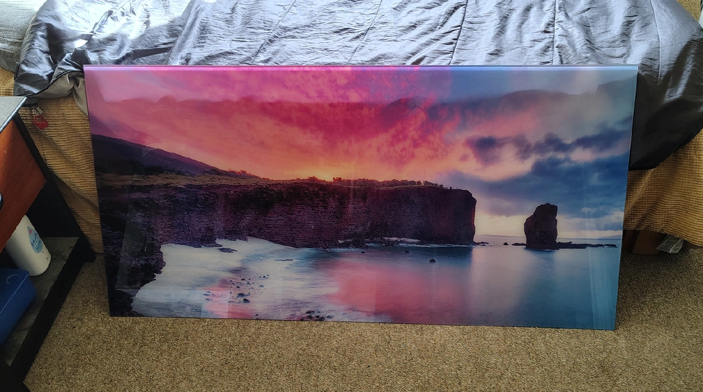 A beautiful landscape print featuring a coastal scene with cliffs, ocean, and a dramatic sky glass pic