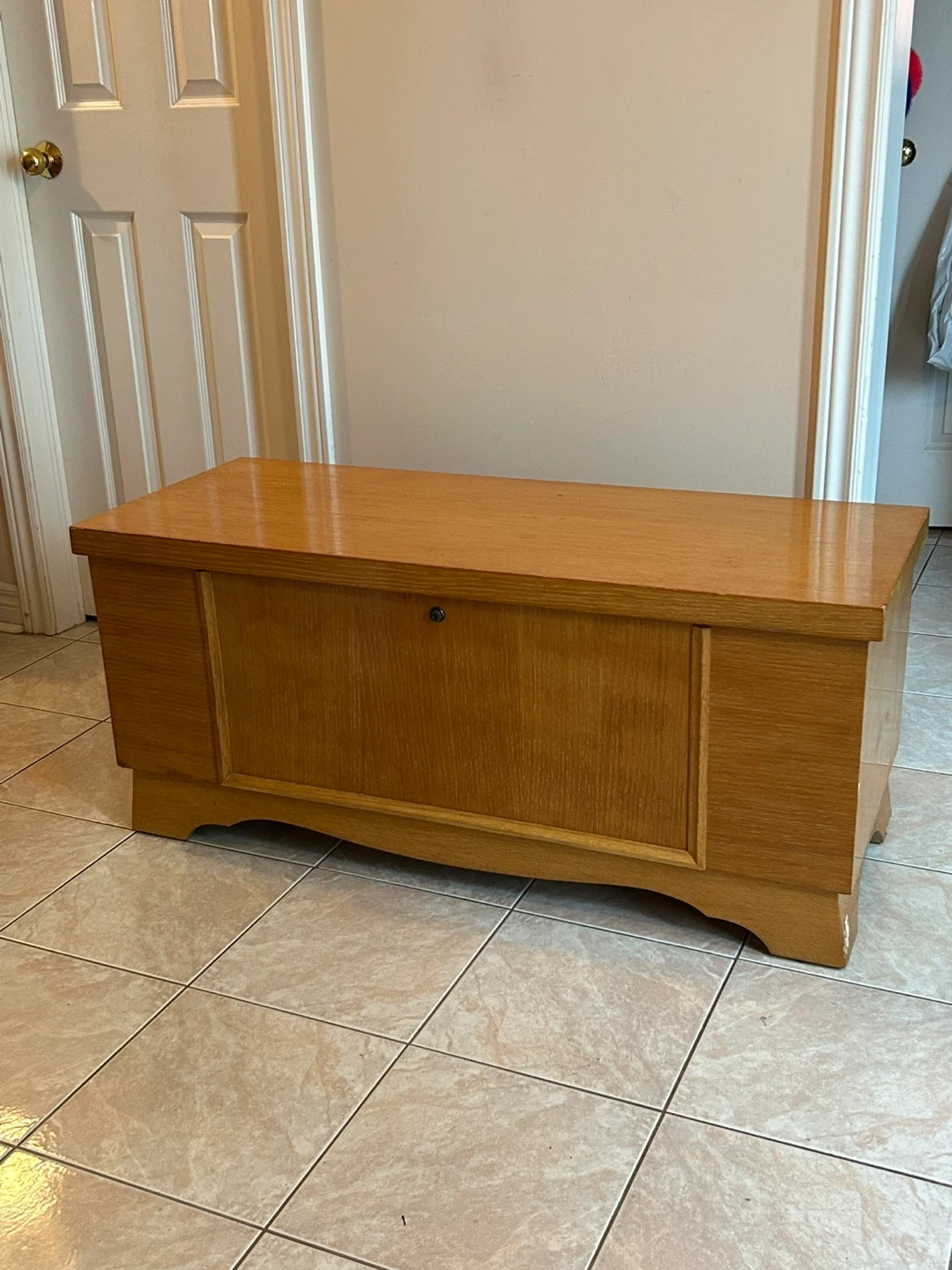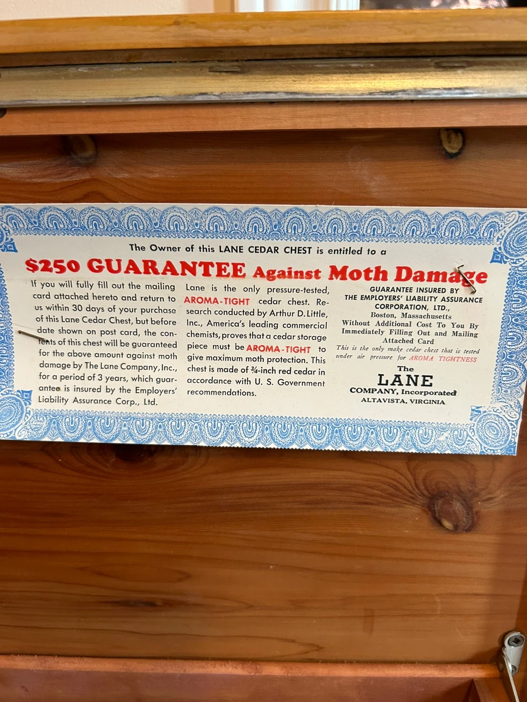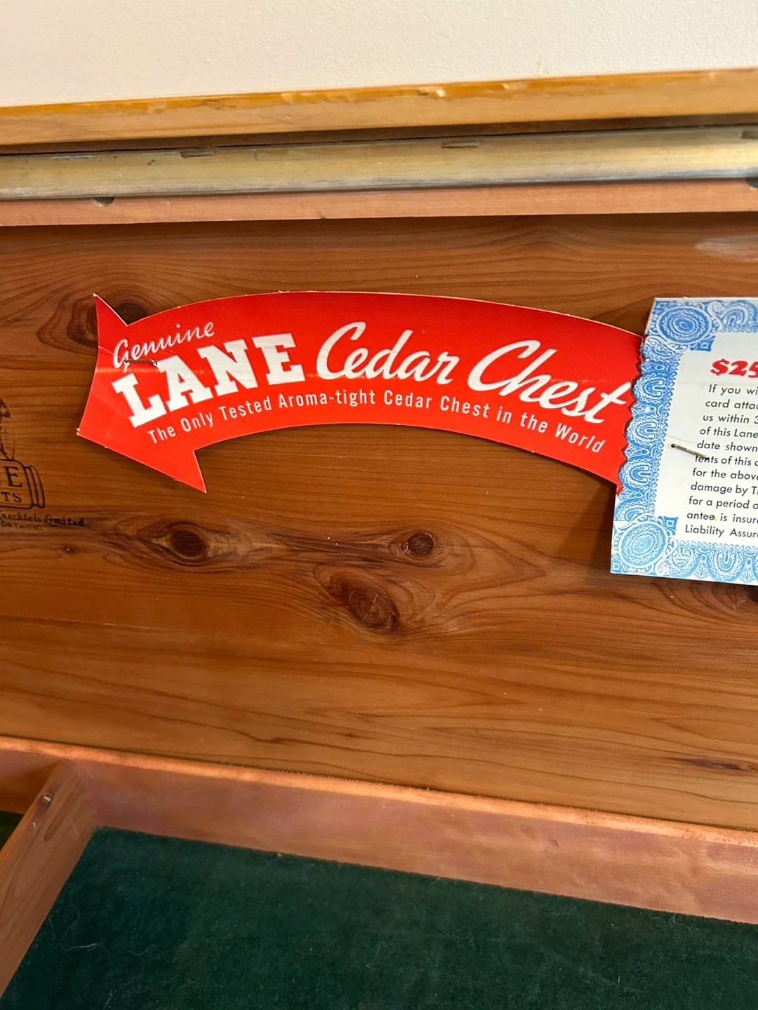 Selling a Lane cedar chest. It's a genuine, aroma-tight cedar chest, perfect for storing clothes and other items. It features a cedar interior and offers moth damage protection. The chest is made of ¼-inch red cedar in accordance with U.S. Government recommendations