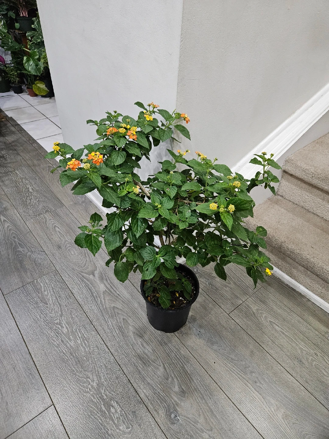 694Lantana plant in a pot, ready to brighten up your space! It's got lovely green leaves and vibrant yellow and orange flowers