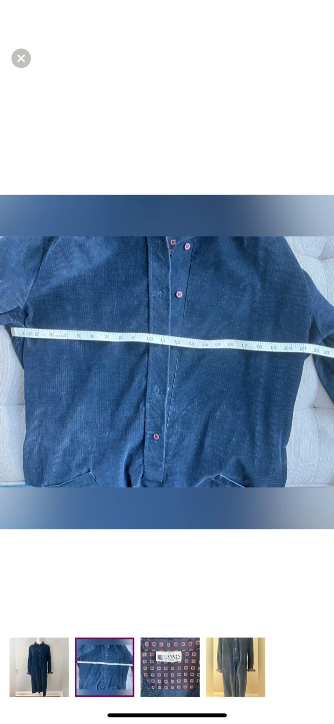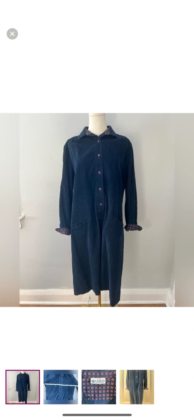 This is a Lanvin corduroy dress from Paris and New York. It is a navy blue colour with a red and white square pattern on the inside of the collar and cuffs. The dress measures approximately 22 inches across the chest. Gorgeous navy blue button down Lanvin corduroy dress, with pockets. Detailed lining. In perfect condition. Looks great with a cinched waist belt. Pit to pit : 21” Length from shoulder to bottom of dress is : 40” Waist : 20” Hip : 22”
