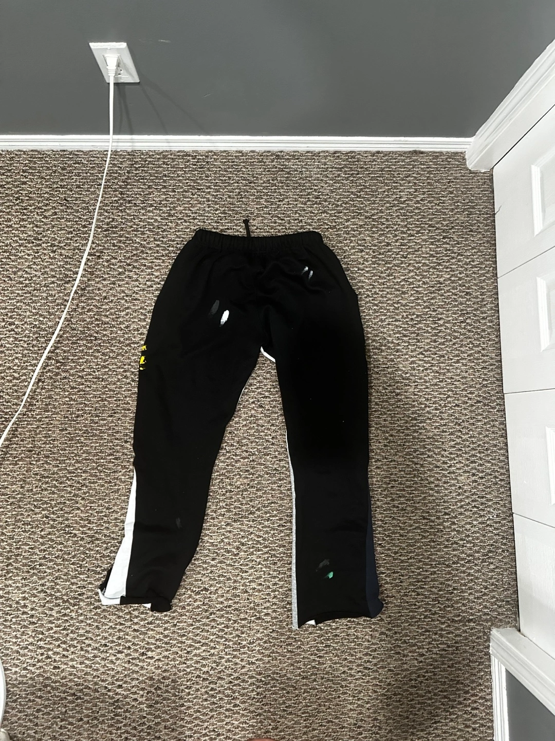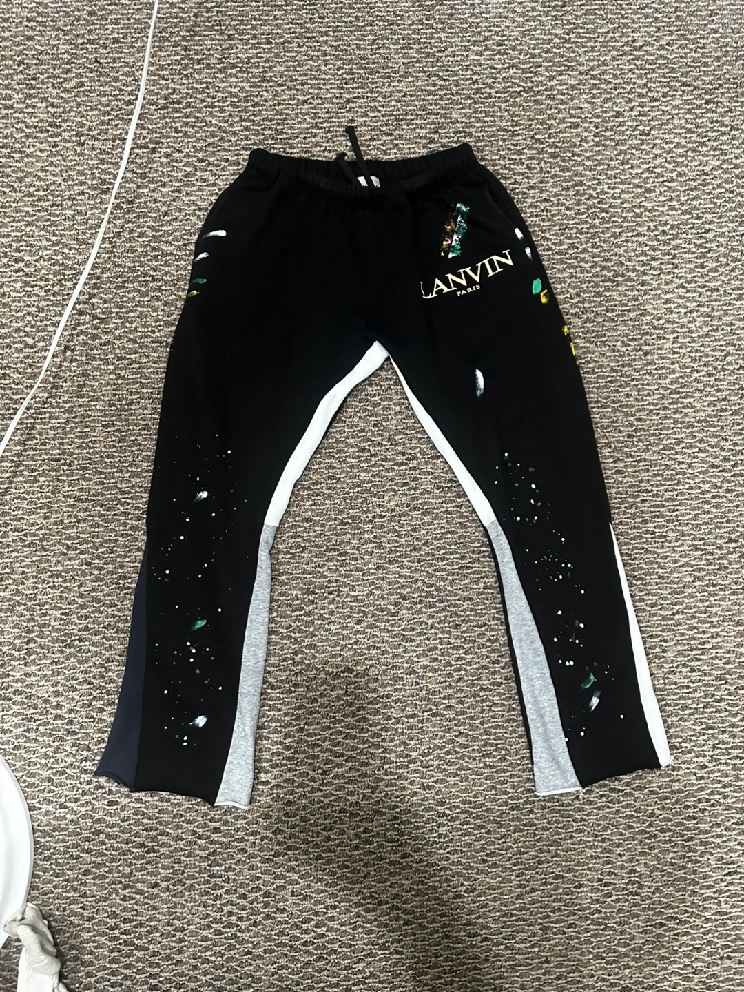 Selling a pair of Lanvin x Gallery Dept. sweatpants. They're black with a unique design and made of 100% cotton. They are in great condition and ready for a new home! And will like nice on any one is a size L and also fits perfectly as a M and it has its package with it too