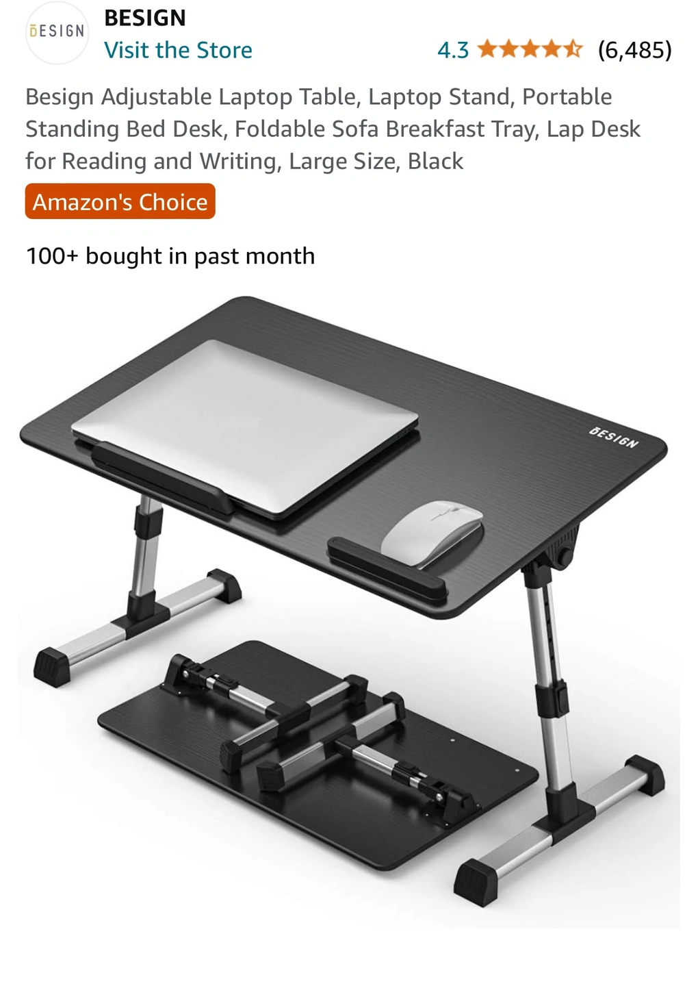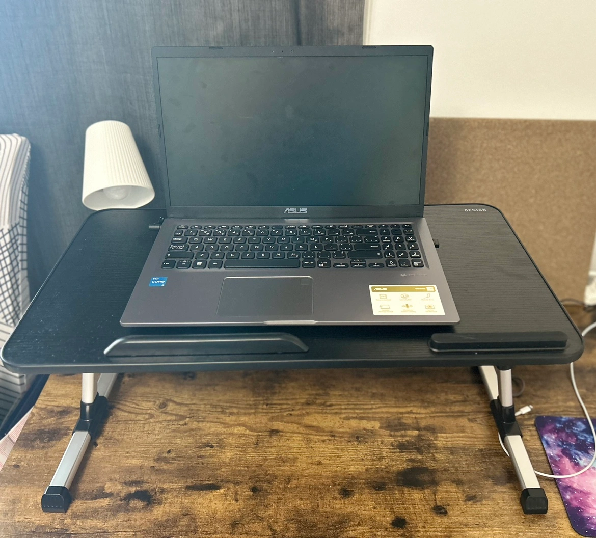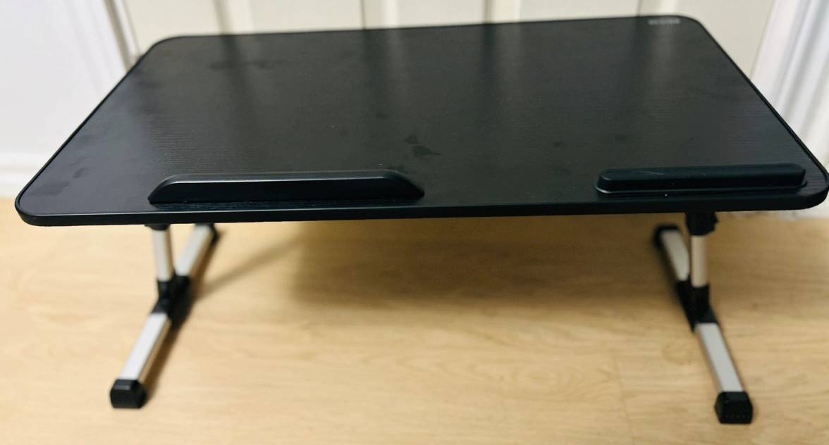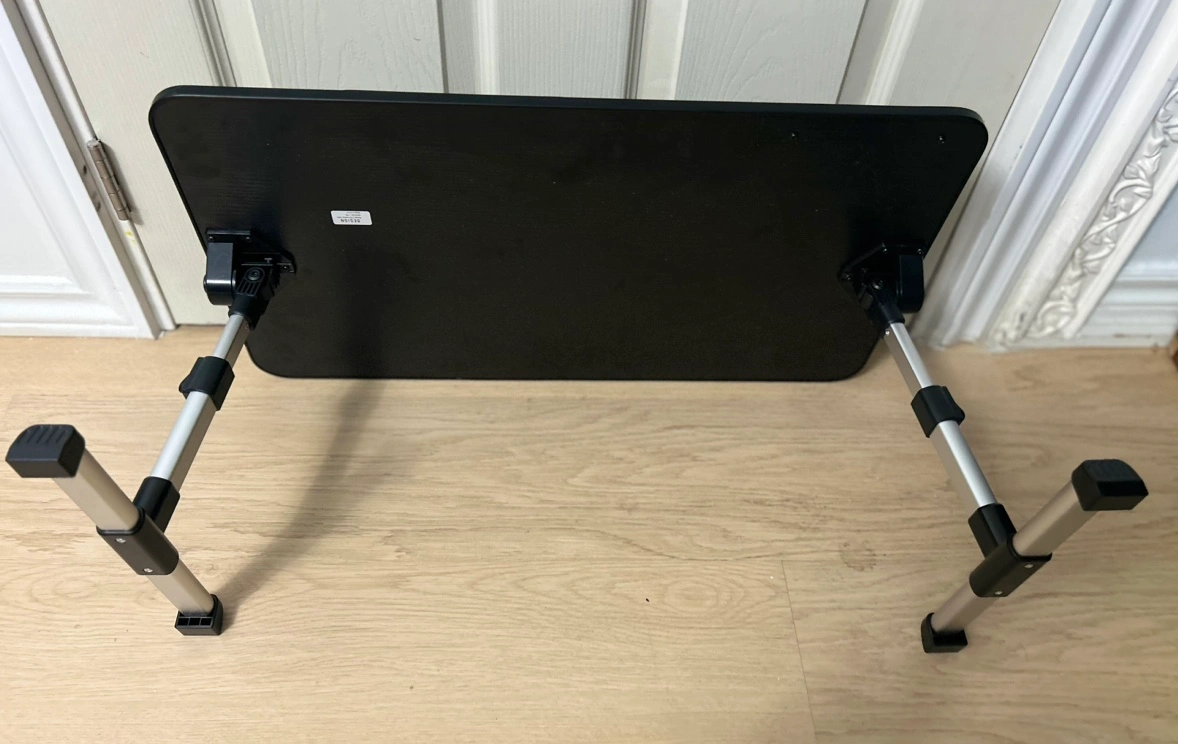 131Black laptop desk with adjustable legs. It is great for working or studying from the couch or bed. The desk is in good condition and has no noticeable scratches or damage. I bought it at Amazon for $59.99 brand new and just use it several times because I bought a study table.