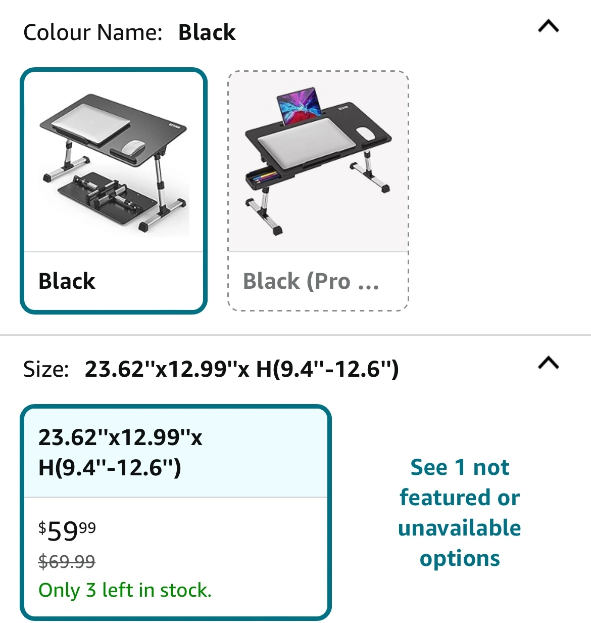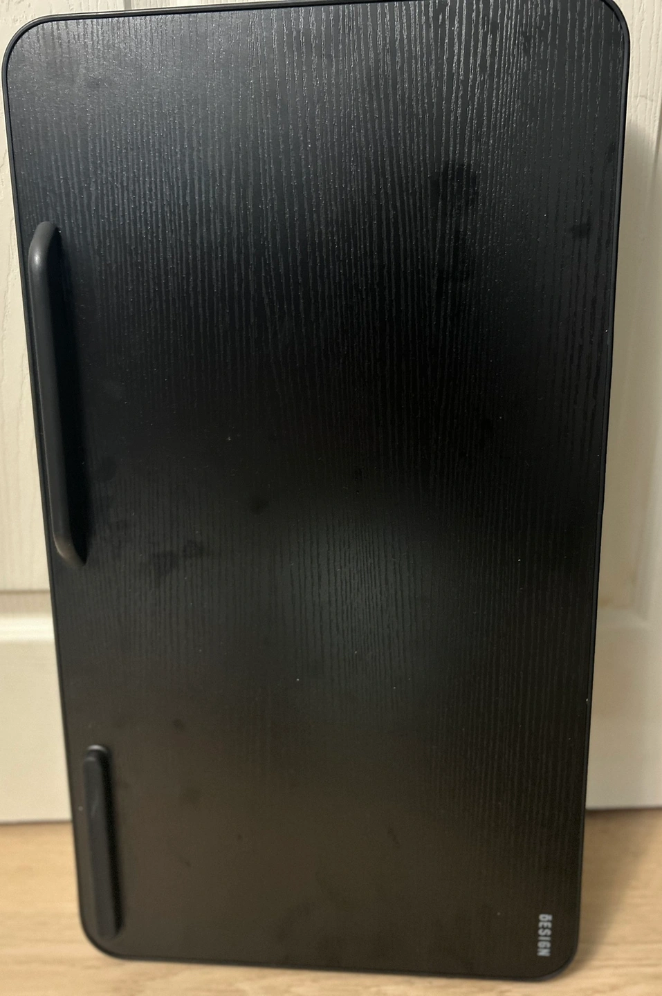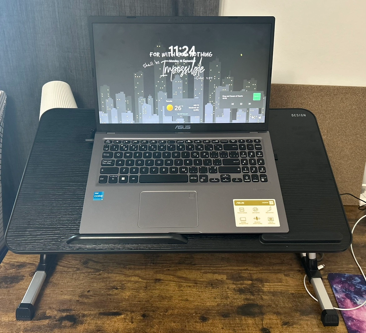 131Black laptop desk with adjustable legs. It is great for working or studying from the couch or bed. The desk is in good condition and has no noticeable scratches or damage. I bought it at Amazon for $59.99 brand new and just use it several times because I bought a study table.