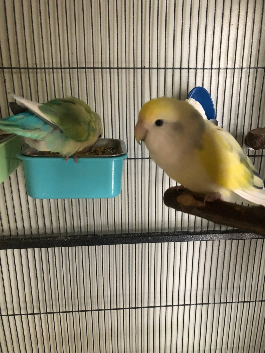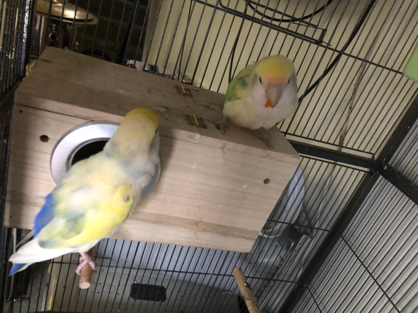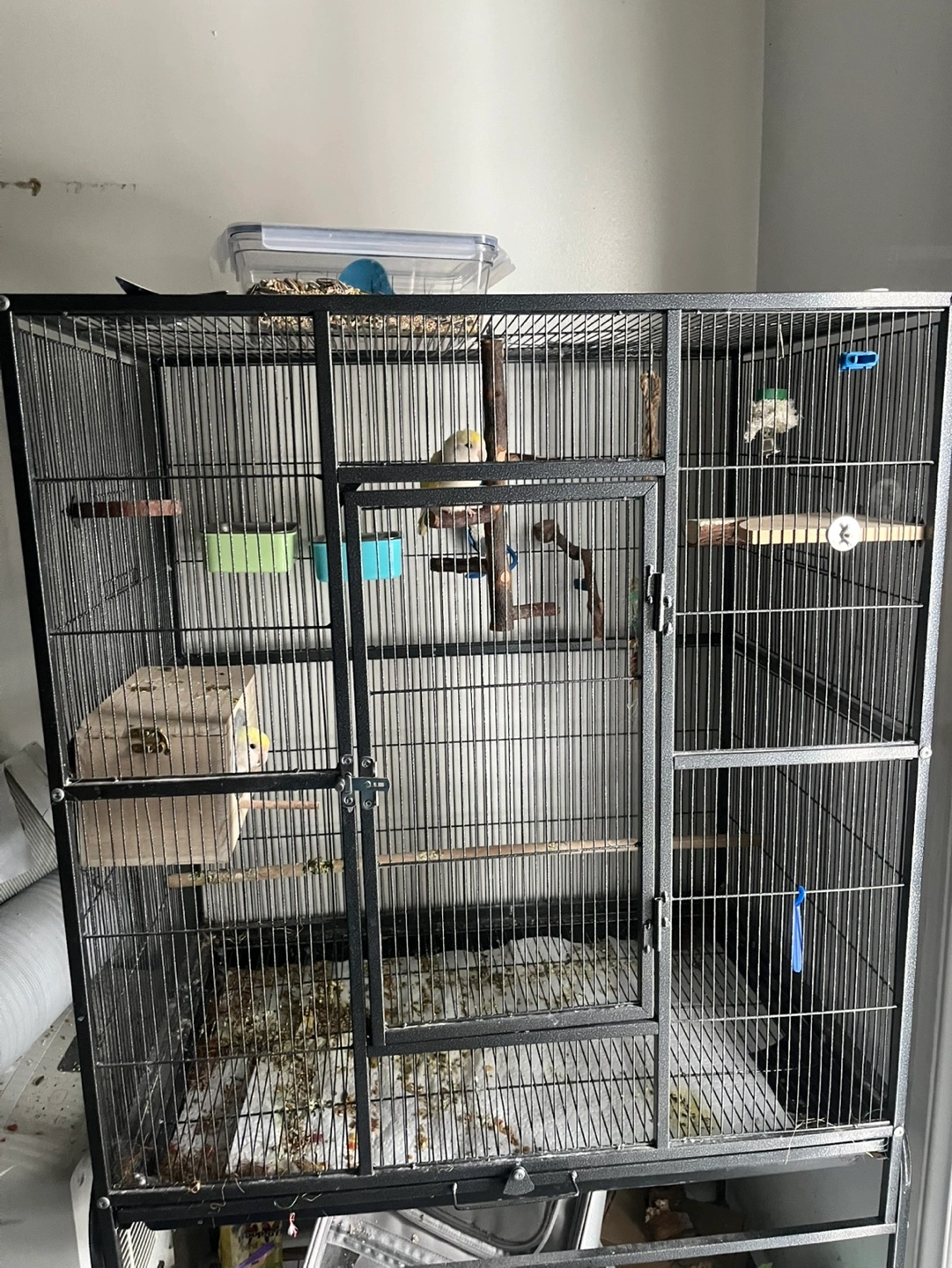 76Spacious black metal bird cage. Includes multiple perches, food and water dishes, nesting box. Suitable for small to medium-sized birds. Some wear and tear.