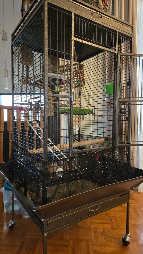 Selling a large bird cage, perfect for parrots or other larger birds! It comes with a stand on wheels for easy moving. Inside, there are various perches, ladders, and toys to keep your feathered friend entertained. The cage also has a removable tray for easy cleaning. Entire setup with plenty of food dishes, perches and toys to have a rotation for your pet.