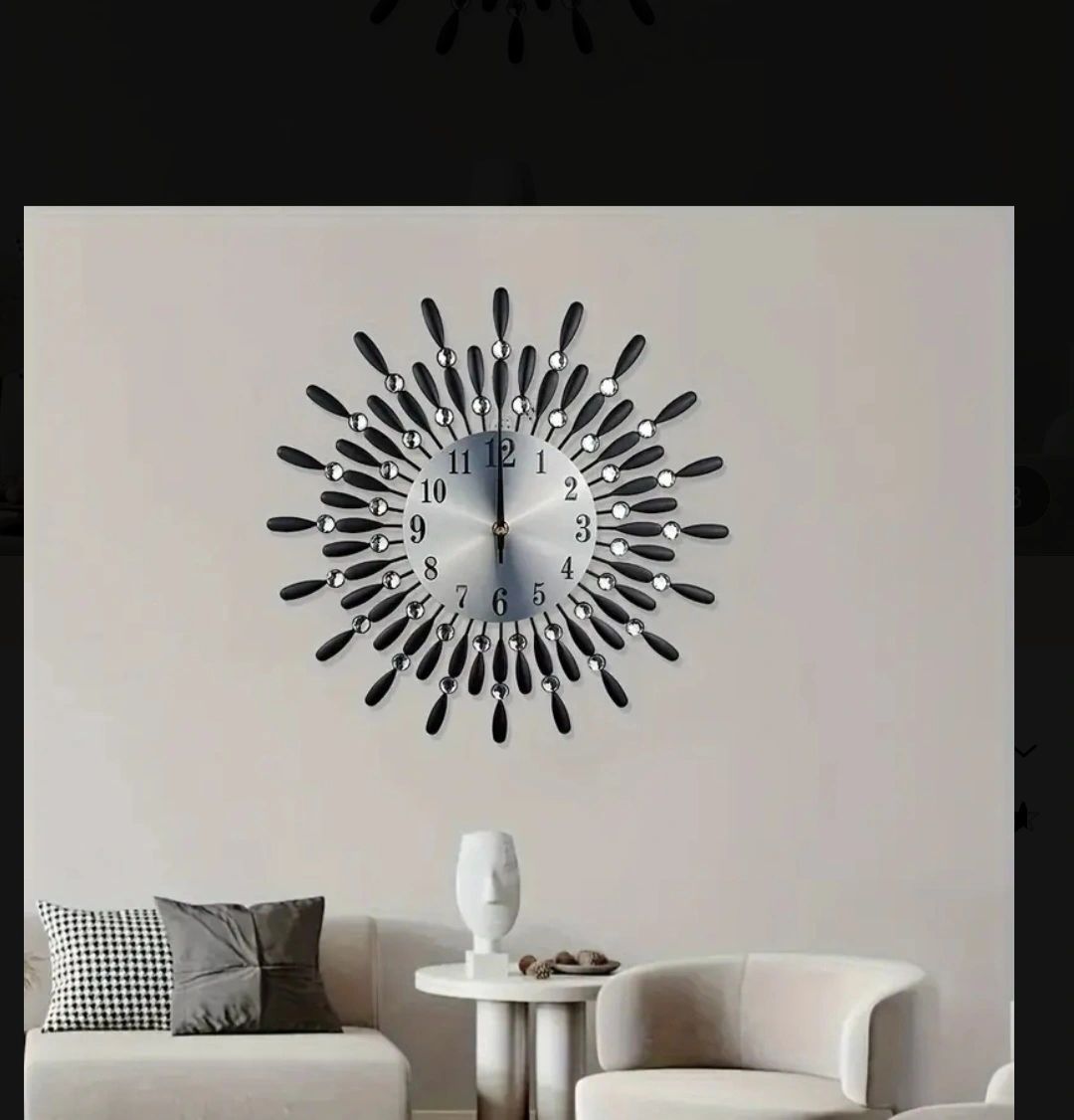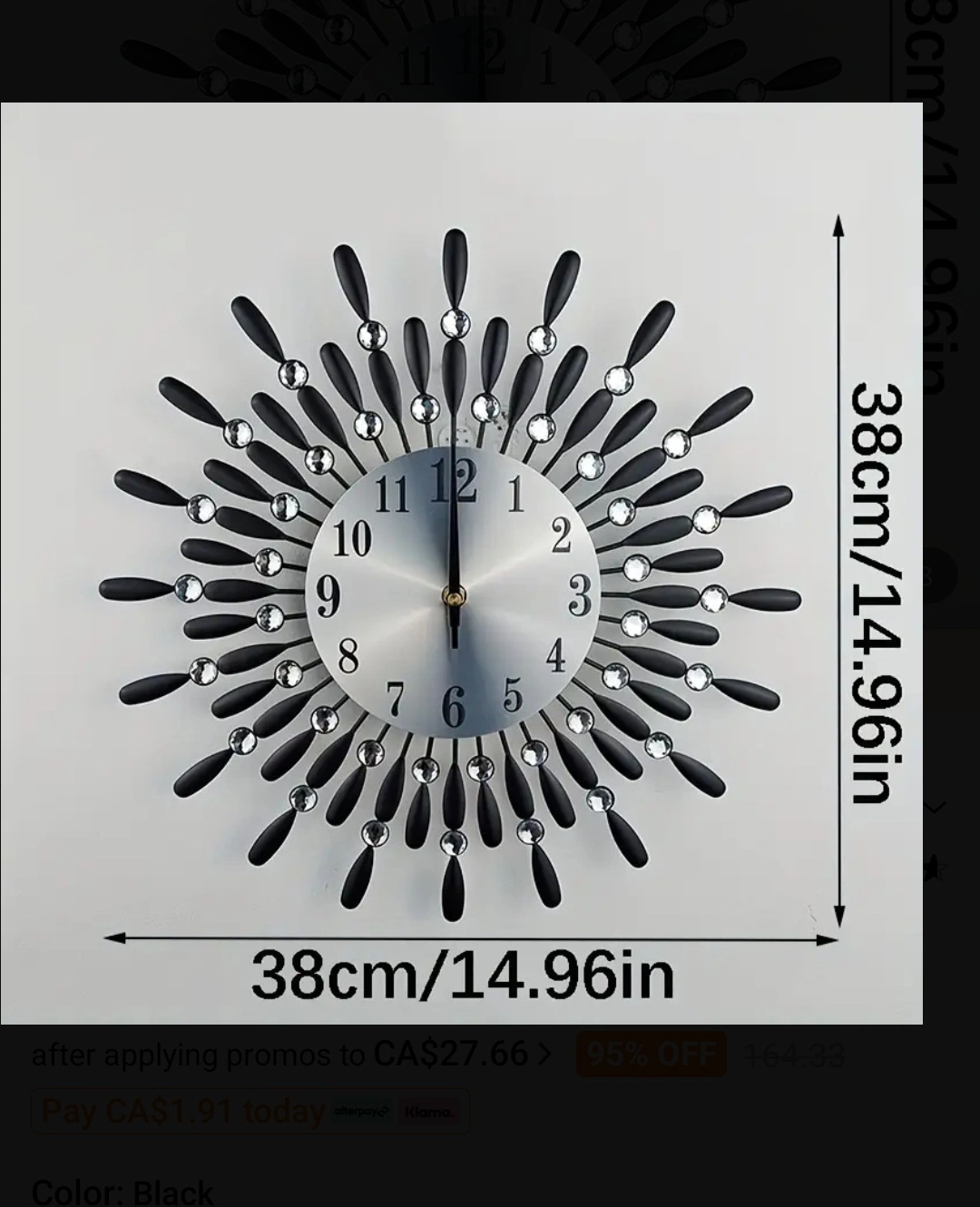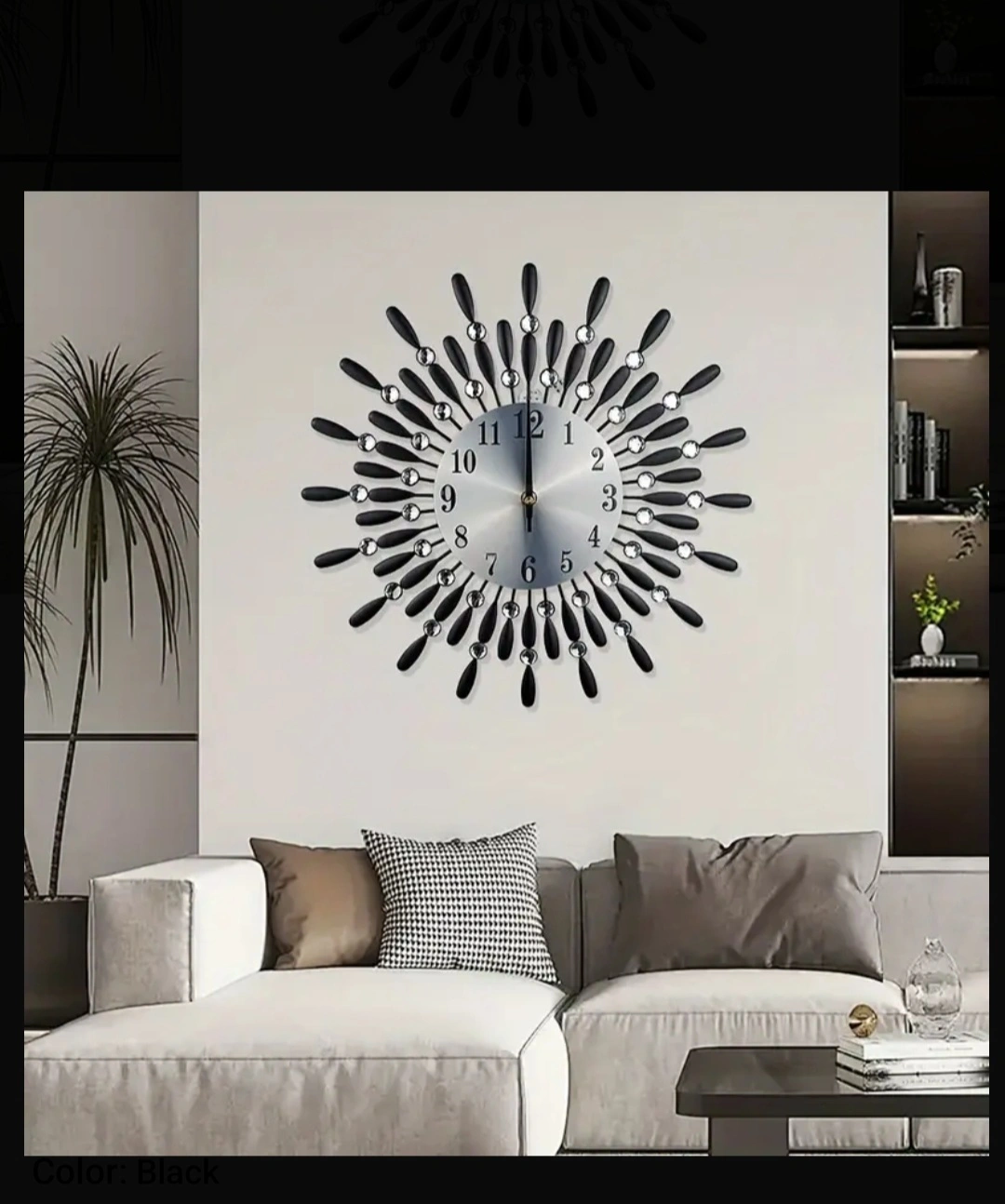 Beautiful large wall clock. Features a sunburst design with black accents and clear crystals. Silver face with black numbers. Measures 38cm in diameter.