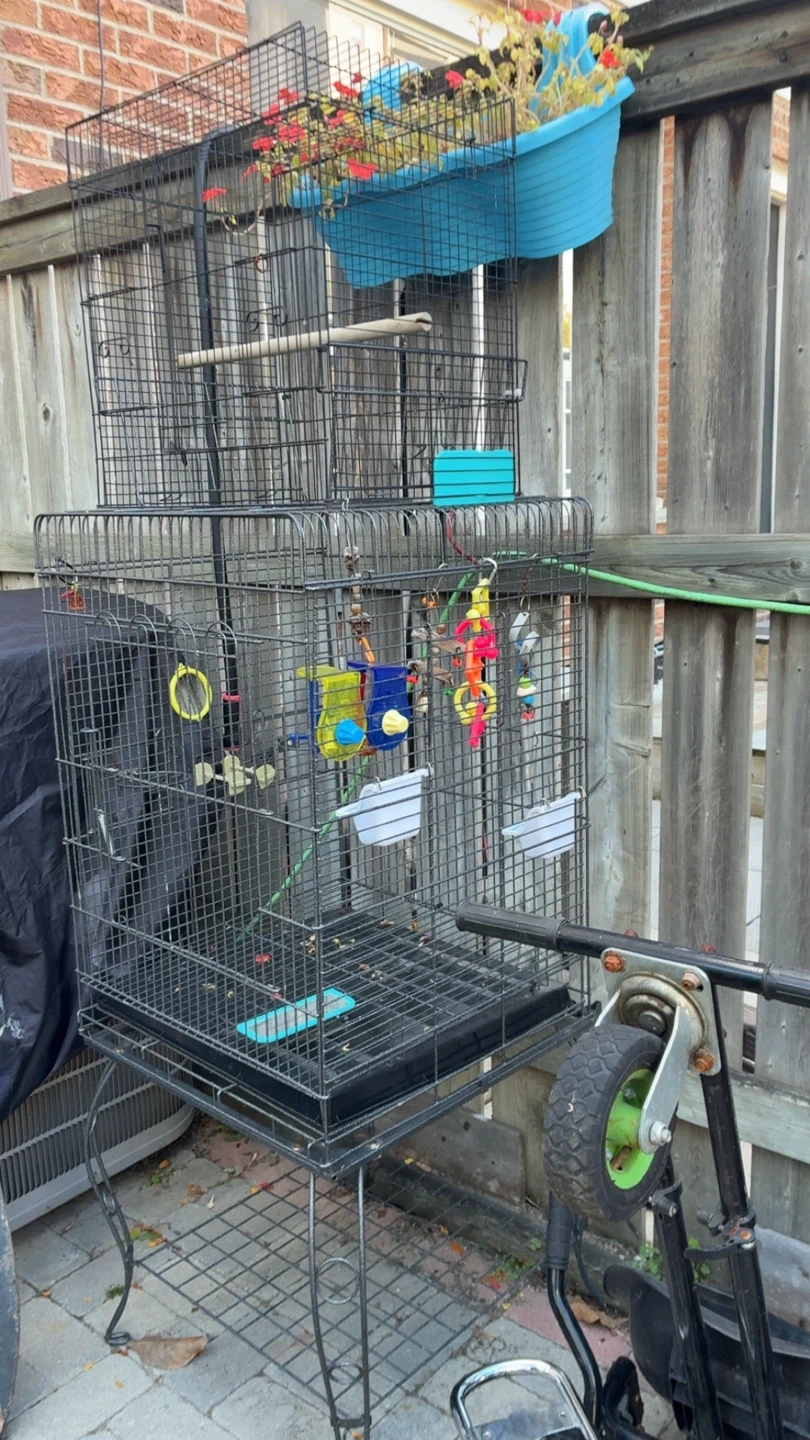 10Selling a large bird cage with a stand. It's in good condition and ready for a new feathered friend! Comes with some perches and toys as pictured. The cage has a removable tray for easy cleaning