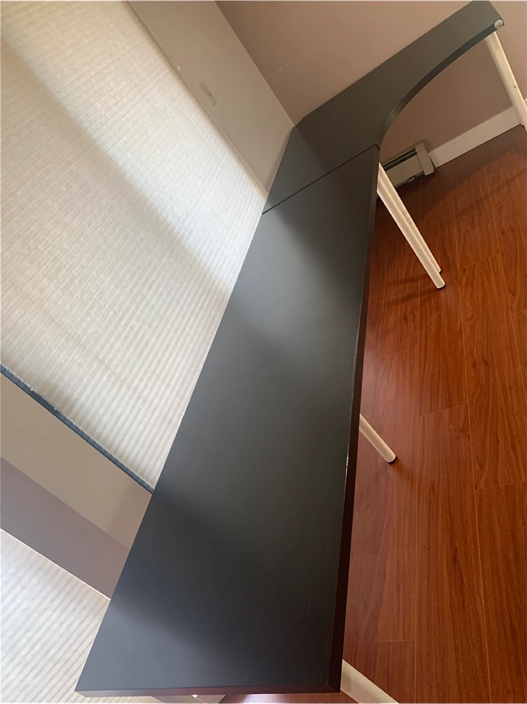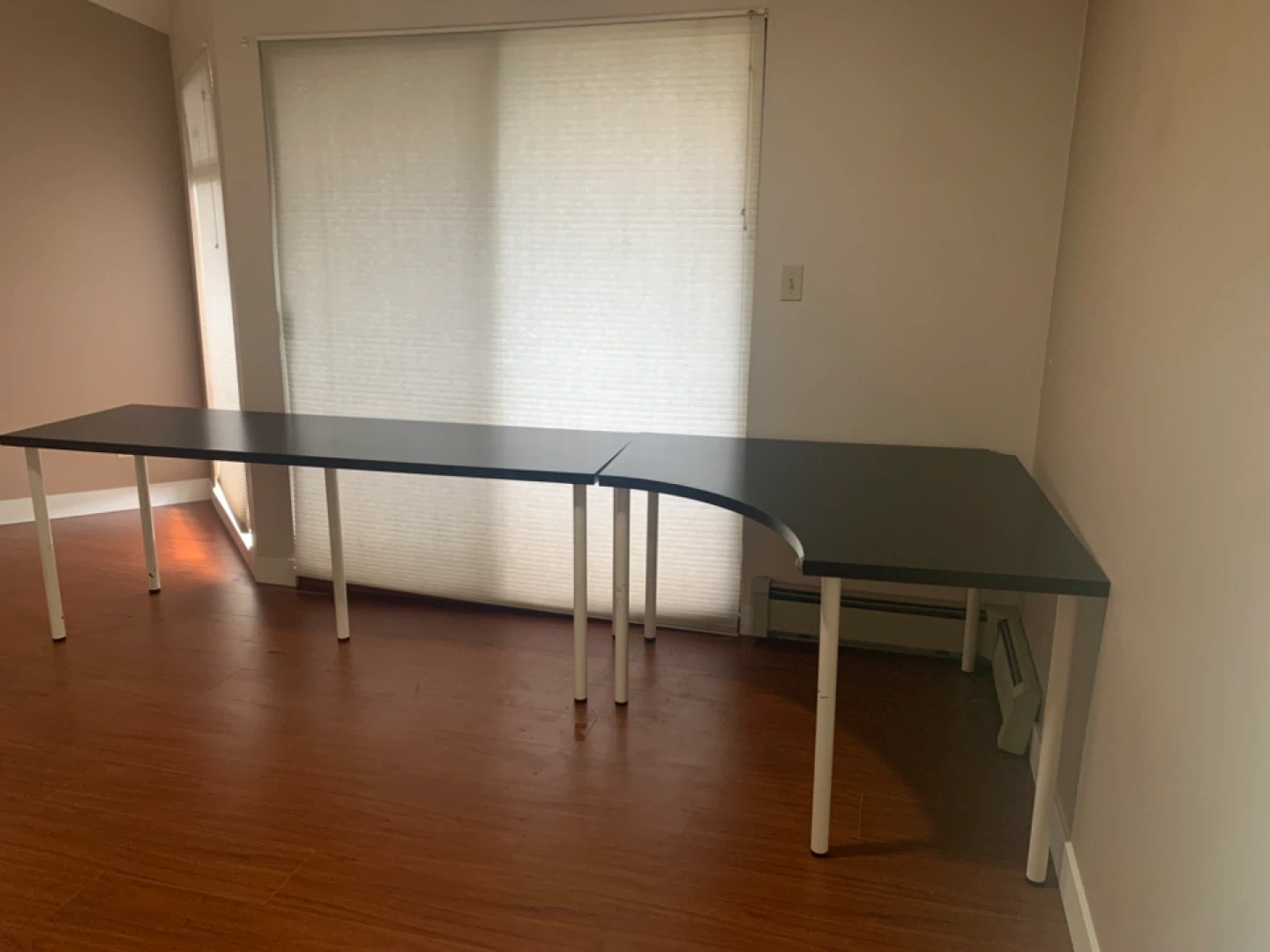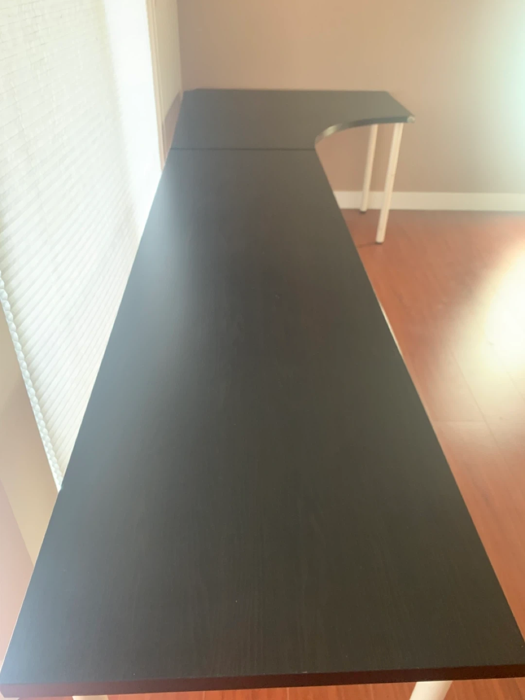 Selling a large L-shaped desk, perfect for a home office or study space! The desk is black with white legs. One side is approximately 79 inches long, and the other is about 60 inches. It's in great condition and ready for a new home