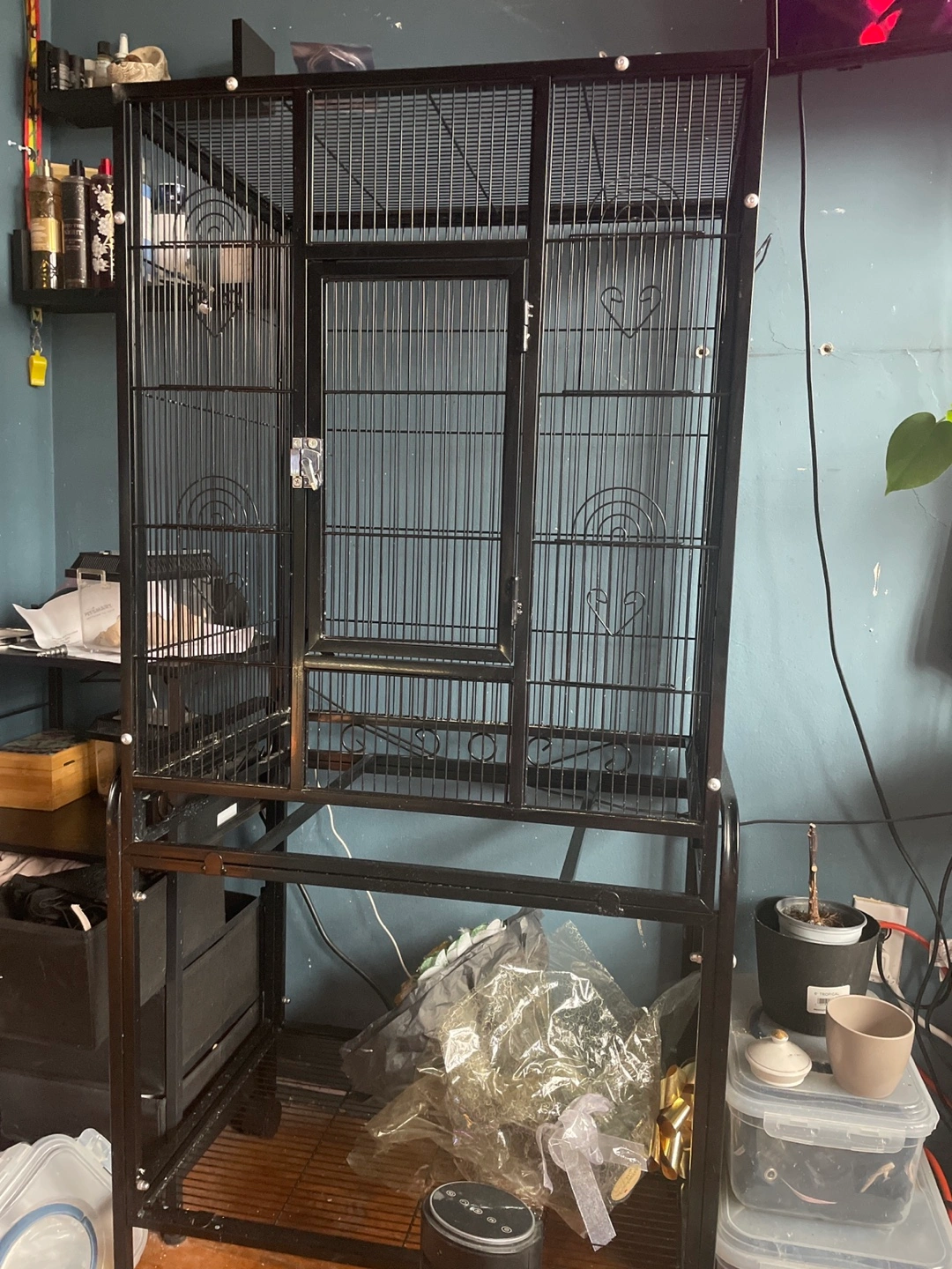 Spacious bird cage, black metal construction. Features doors and a pull-out tray. Includes a stand for easy access. Ideal for multiple budgies/ parakeets or medium size birds. 24”x17”x54”(LxWxH) Cage 24”x17”x30”(byLxWxH)