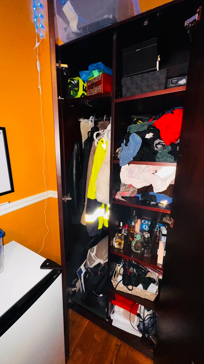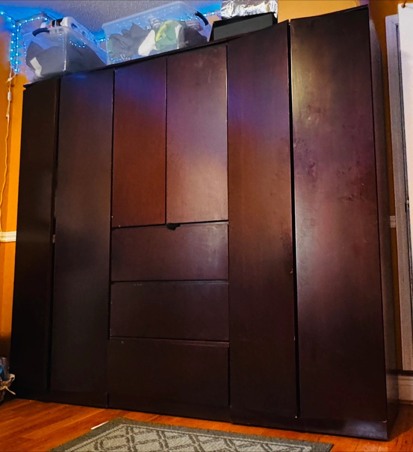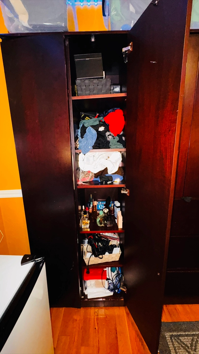 Selling a large wardrobe in a dark brown colour. It has lots of space for storage, including drawers and shelves. It's perfect for organizing clothes and other items!