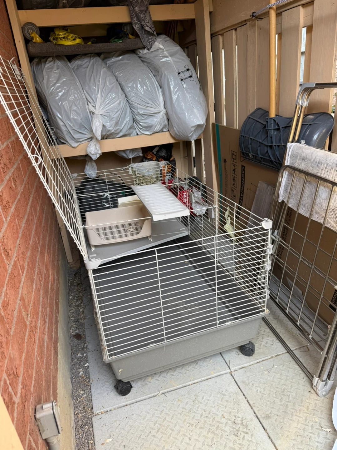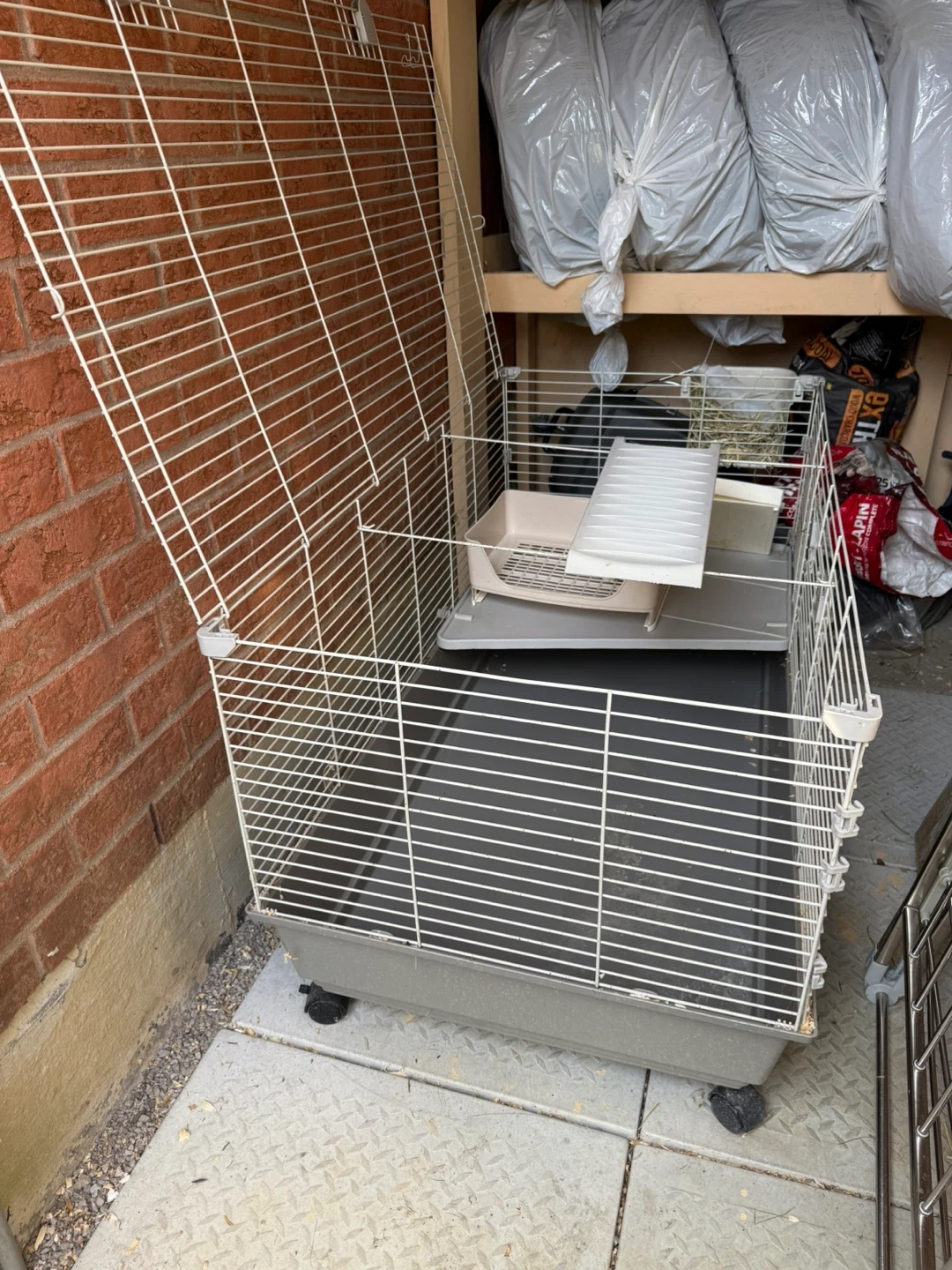 Selling a used rabbit or guinea pig cage! It comes with accessories as pictured, including a litter box and a platform. The cage is on wheels, making it easy to move around. It's in good condition and ready for a new furry friend!