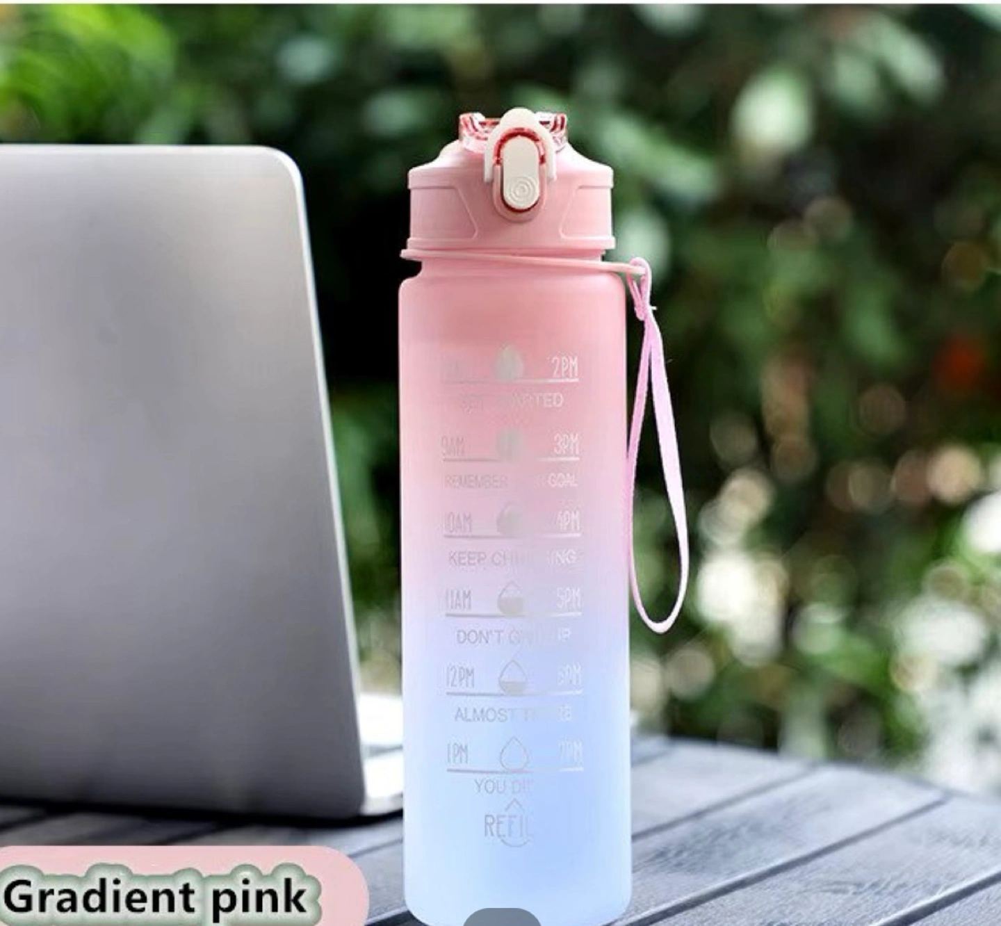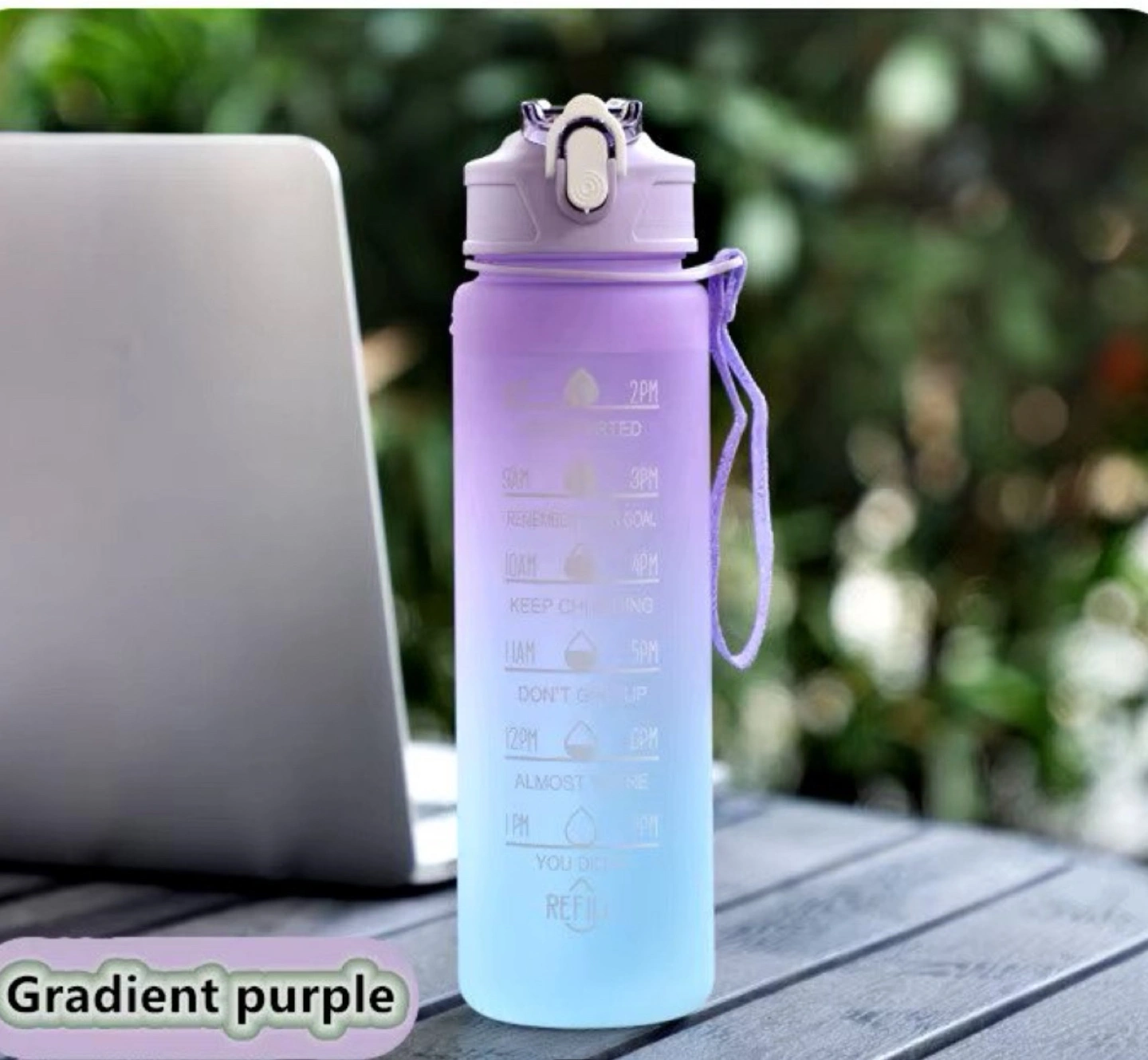Motivational water bottle. Features time markers and a carrying strap. Durable plastic. Gradient colours available.
