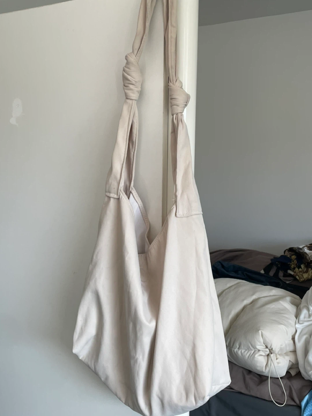 25It’s very large and holds water bottle, laptop, books, etc. Very sturdy. Lightly used with some slight stains which is easily removable in the wash. It’s super cute and originally bought from Korean online store Codibook.