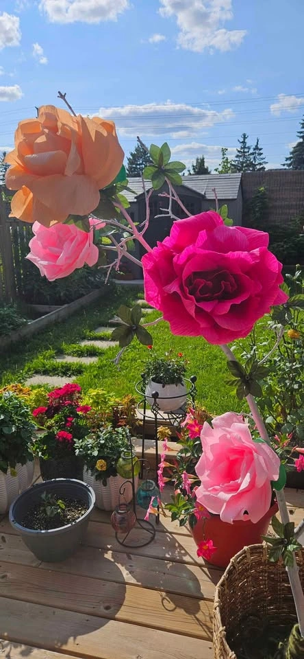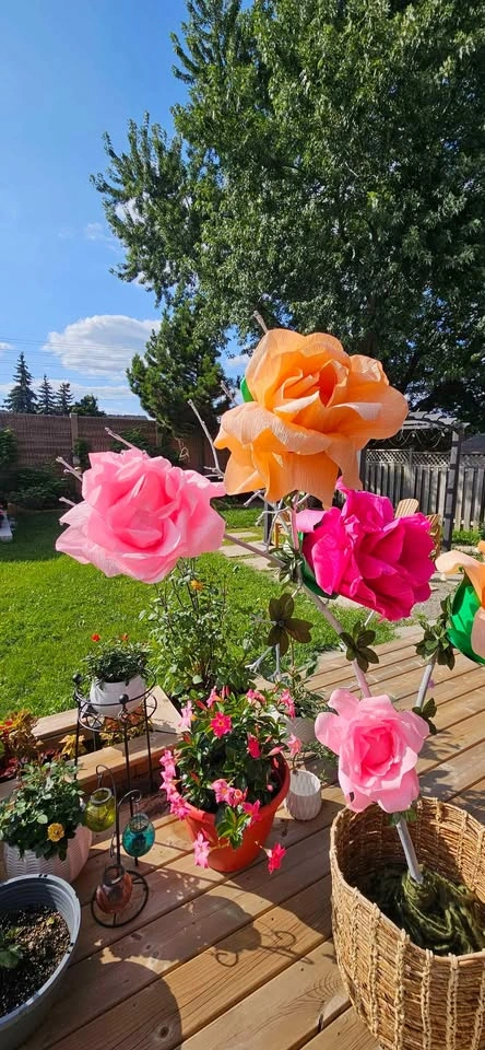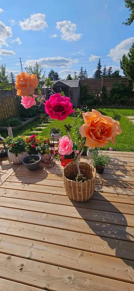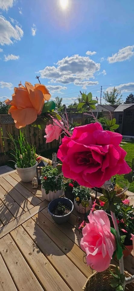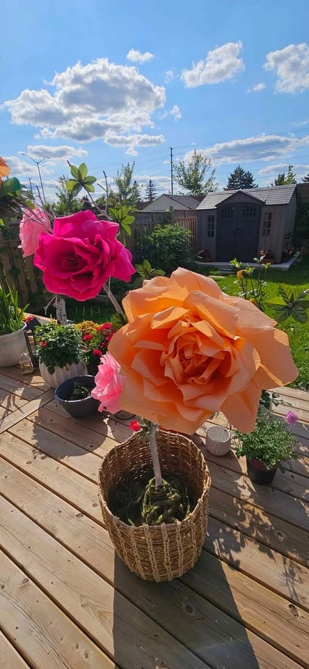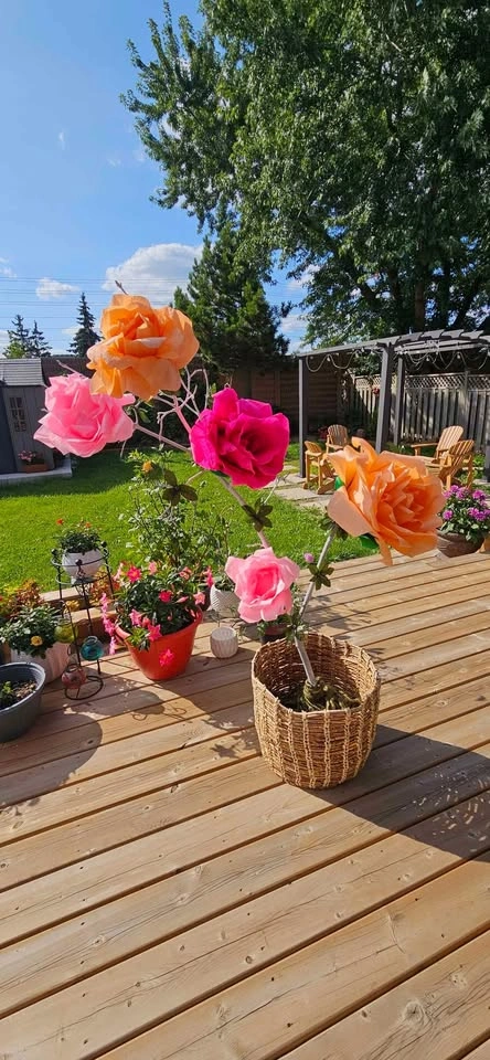 Great for parties, bridal and baby showers. Includes base. 5 flower arrangement with real wood trunk.