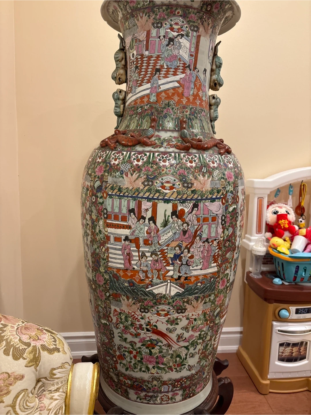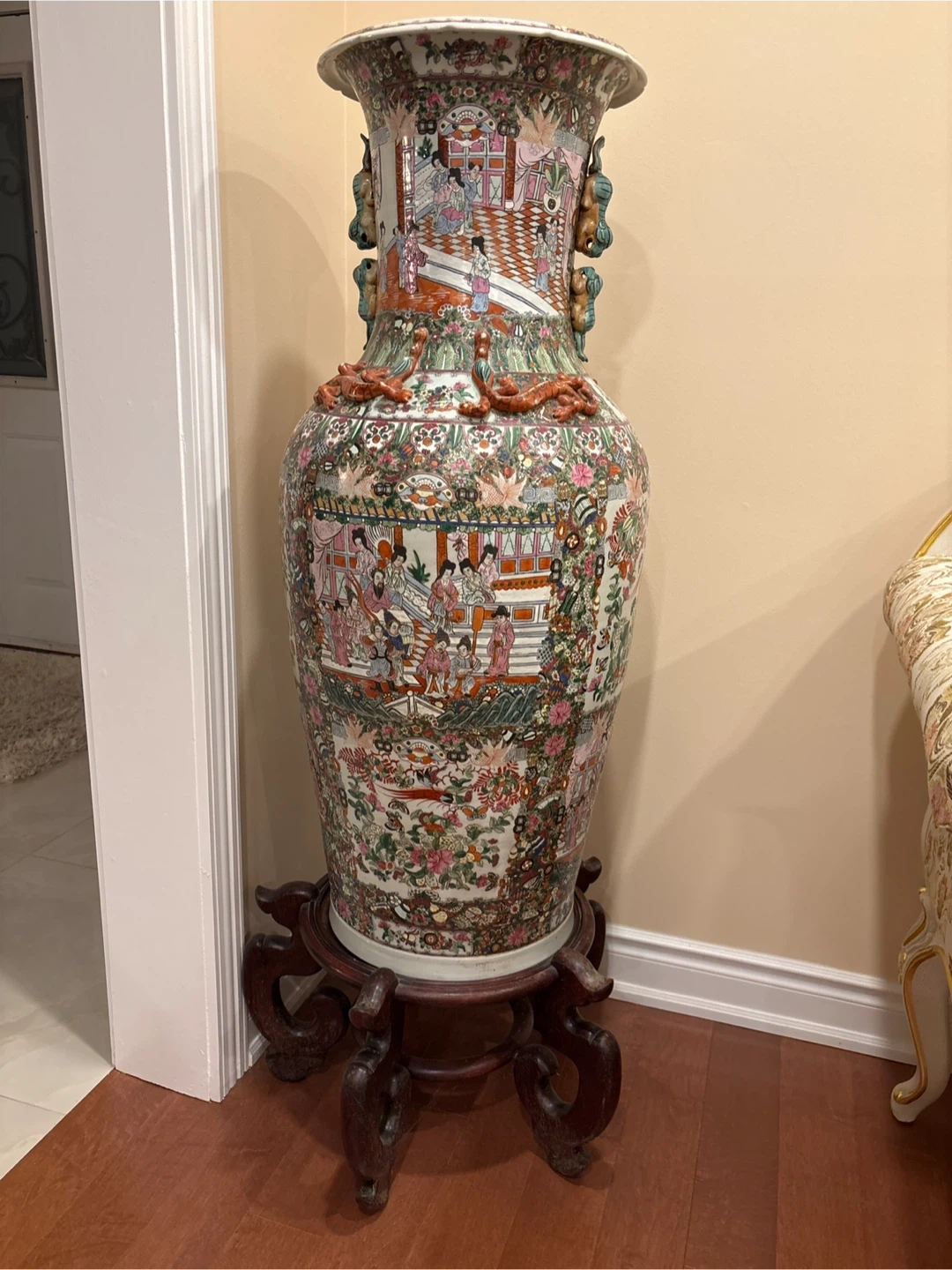 This is a large, decorative Chinese vase. It features intricate designs and vibrant colours. It would be a beautiful addition to any home. Set of 2 with the wool stand $1900 /each must buy 2 together can delevily , depend the location
