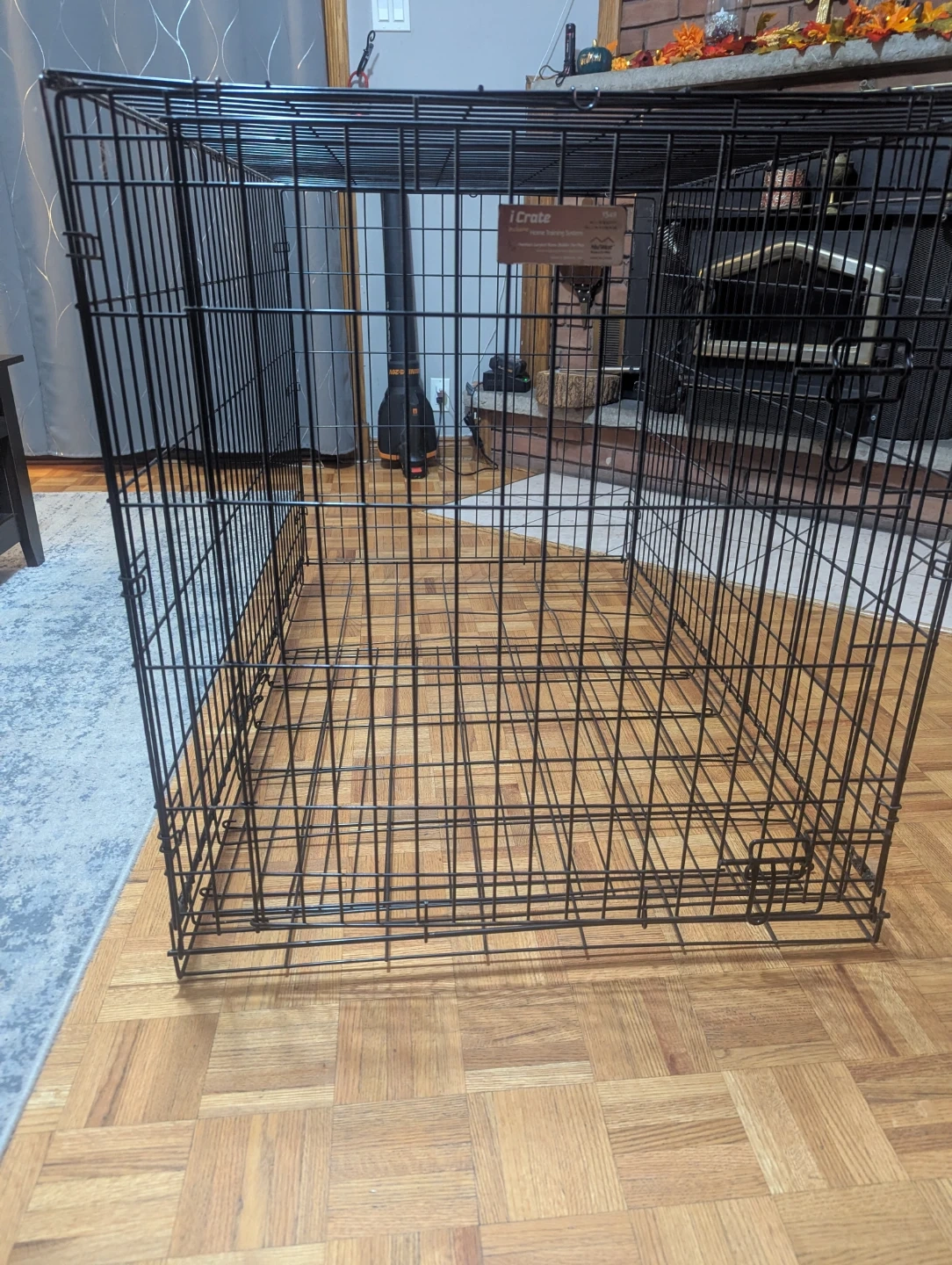 60Large dog crate for sale. Missing bottom tray ( which you can buy at pet smart). Folds down for easy storage. 48"L x 30"W x 33"H