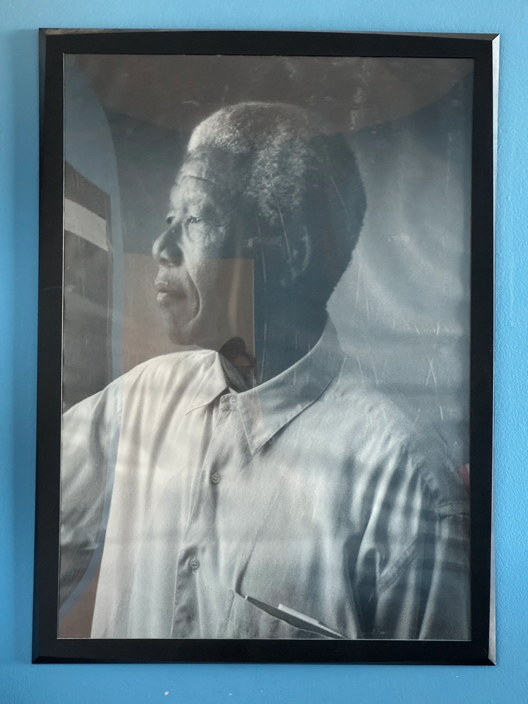 Framed photo of Nelson Mandela, black frame with vinyl cover to protect it. 30x22 inch frame. Simple Black Frame.