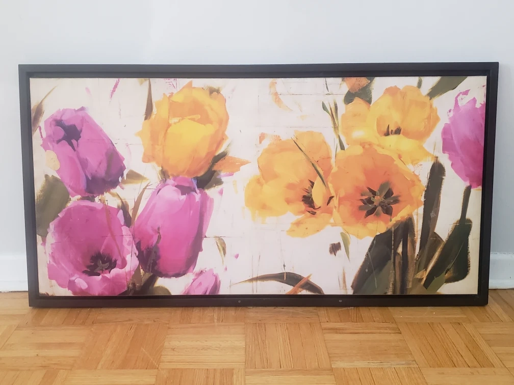 Beautiful colourful floral artwork. Features yellow and purple tulips. Sturdy black frame. Perfect for adding a touch of colour to your home decor.